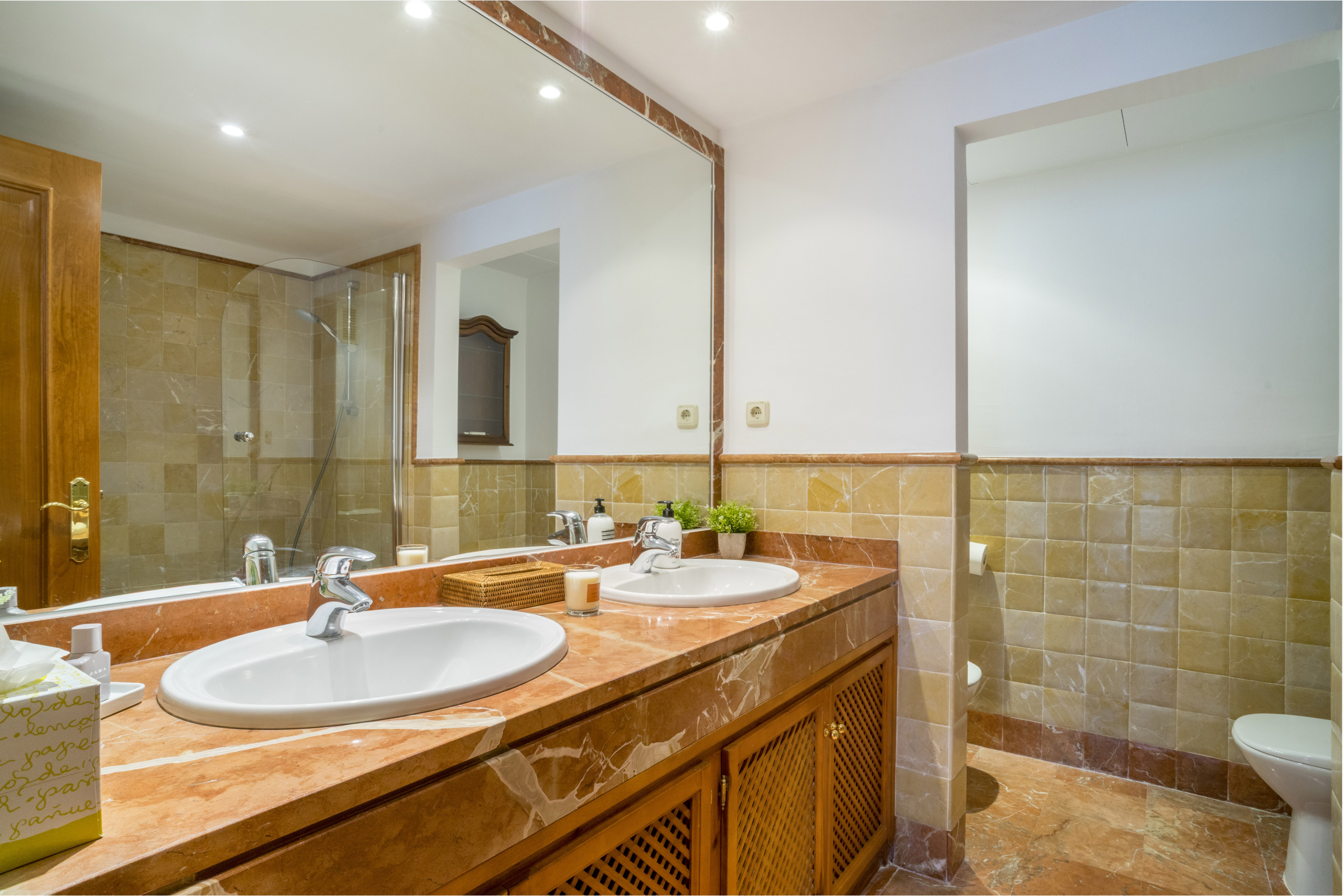 Das Hauptschlafzimmer profitiert von direktem Zugang zur Terrasse und verfügt über ein eigenes Badezimmer mit Badewanne. Ein komfortables Gästeschlafzimmer wird von einem separaten Badezimmer mit begehbarer Dusche bedient, was die Immobilie ideal für Paare, kleine Familien oder diejenigen macht, die einen raffinierten Home-Office-Raum suchen.