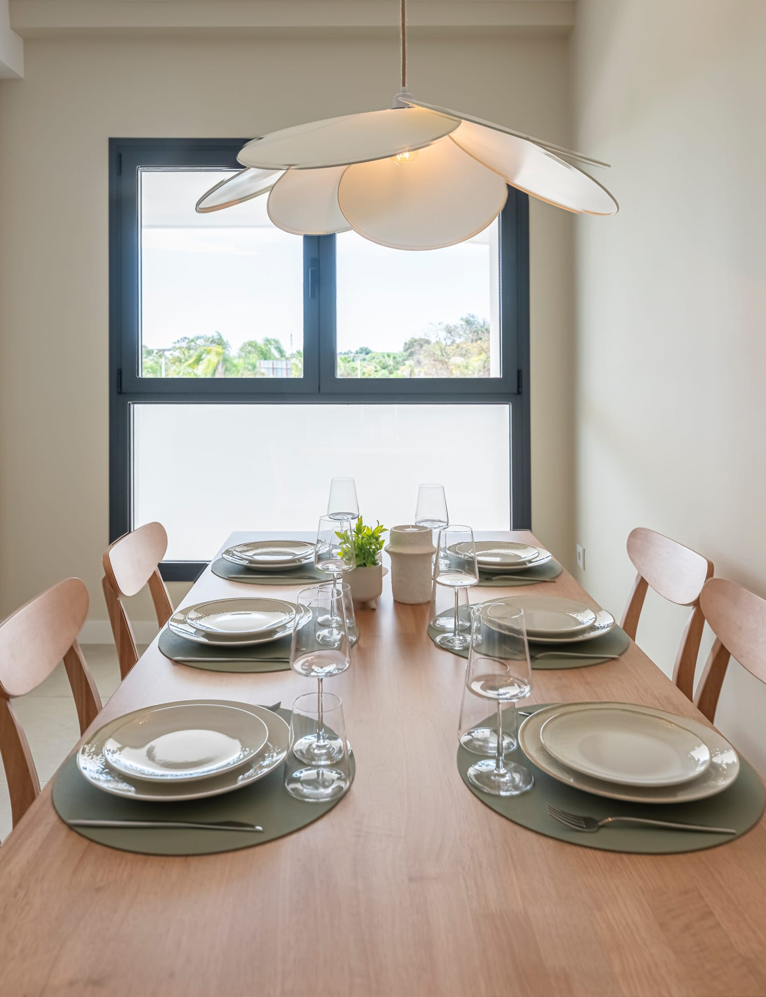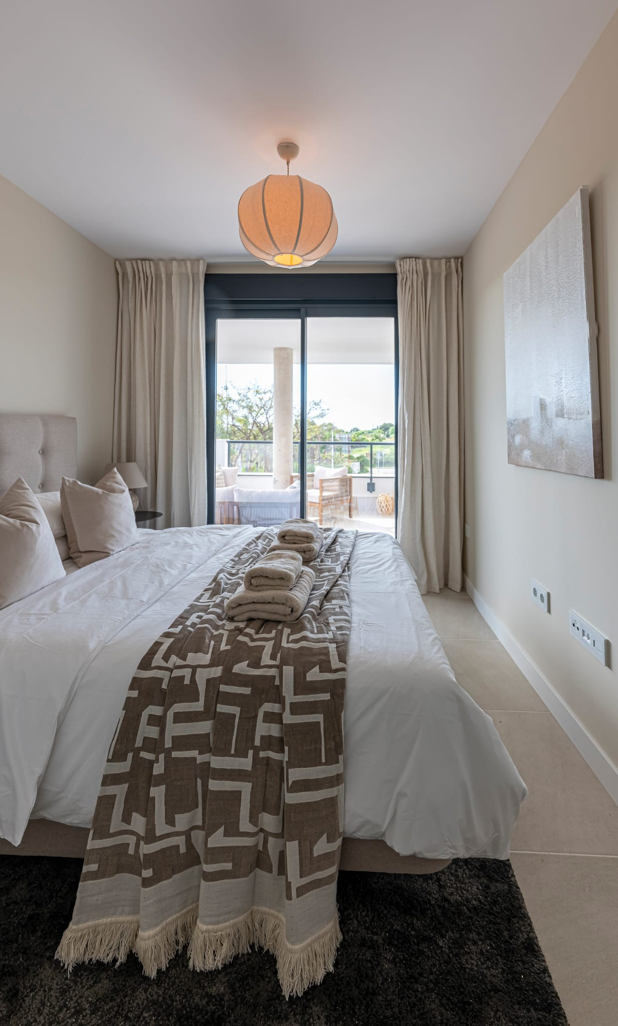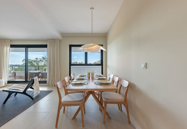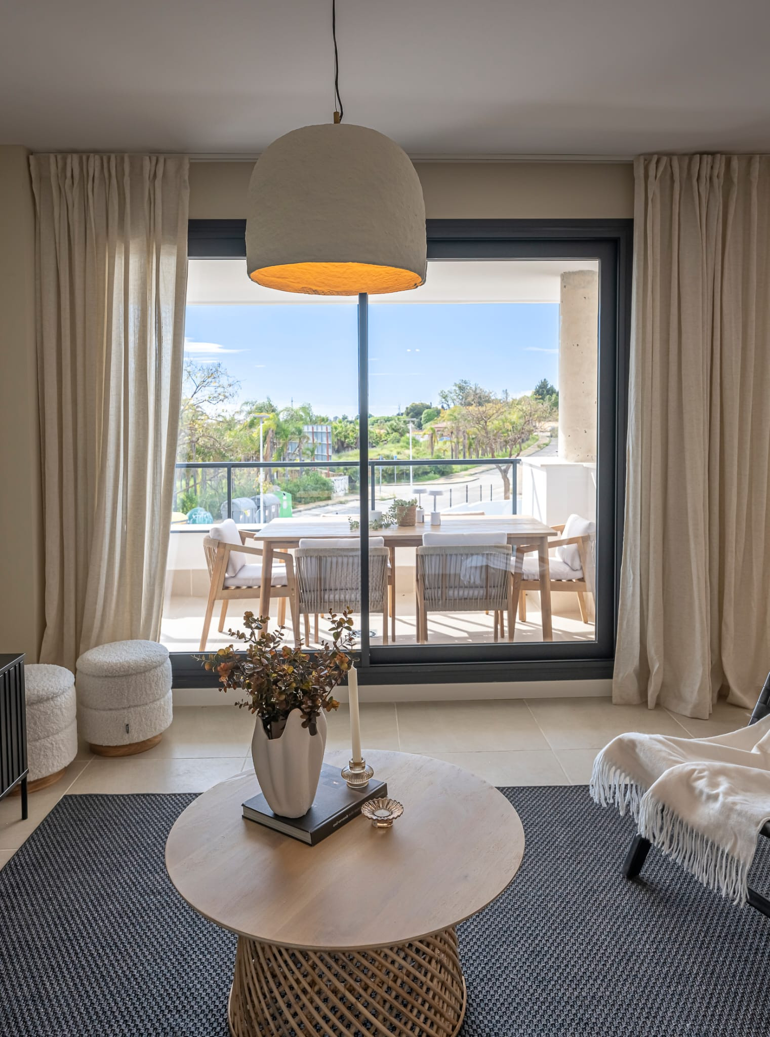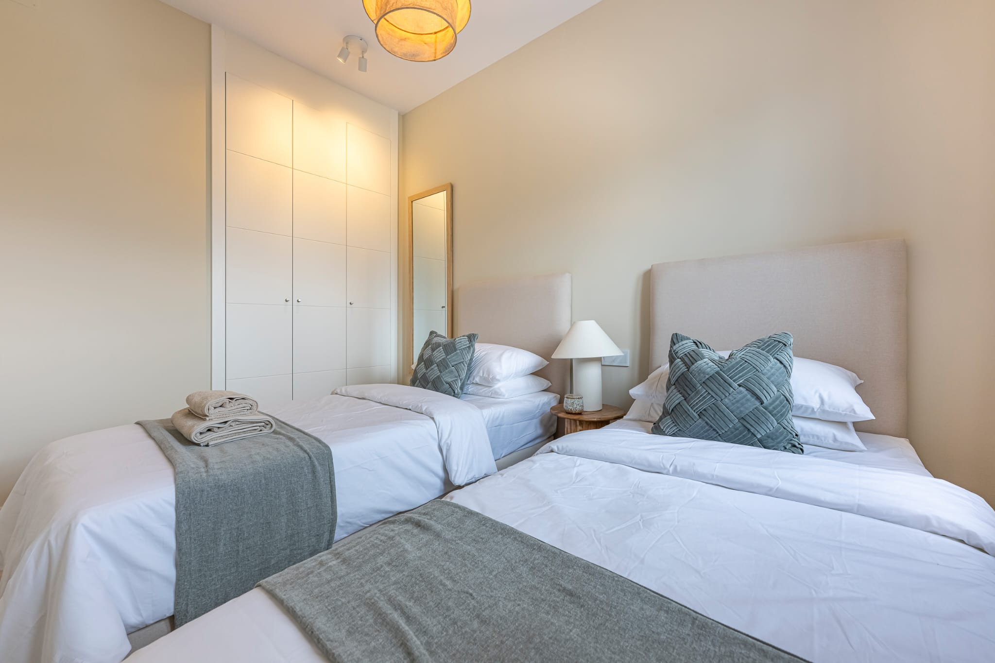 Die Wohnung verfügt über einen hellen, kombinierten Wohn- und Essbereich mit einer integrierten offenen Küche, die einen komfortablen und zeitgemäßen Wohnraum schafft. Von der Lounge aus können Sie direkt auf eine wunderschöne Terrasse treten, die sowohl mit einem Sofa als auch mit einem Essbereich ausgestattet ist, ideal zum Entspannen und Unterhalten im Freien. Das Hauptschlafzimmer verfügt über ein eigenes Badezimmer und Zugang zur Terrasse, während die beiden Gästezimmer jeweils zwei Einzelbetten bieten und ein modernes Badezimmer teilen.