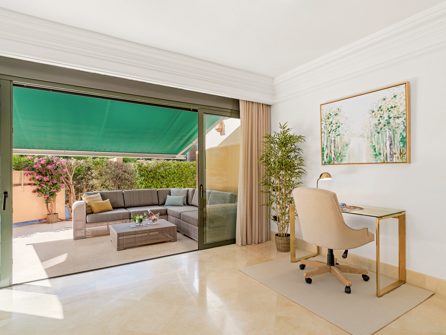 Die Wohnung verfügt über einen geräumigen Wohn- und Essbereich, der sowohl Komfort als auch Praktikabilität bietet, einschließlich eines separaten Arbeitsbereichs, der sie ideal für Remote-Arbeit macht. Große Türen ermöglichen direkten Zugang zu einer privaten Terrasse, die perfekt zum Outdoor-Dining oder zum Genießen des ganzjährigen Sonnenscheins von Marbella ist. Die voll ausgestattete Küche umfasst einen gemütlichen Frühstücksbereich und bietet einen funktionalen und angenehmen Raum für den Alltag.
