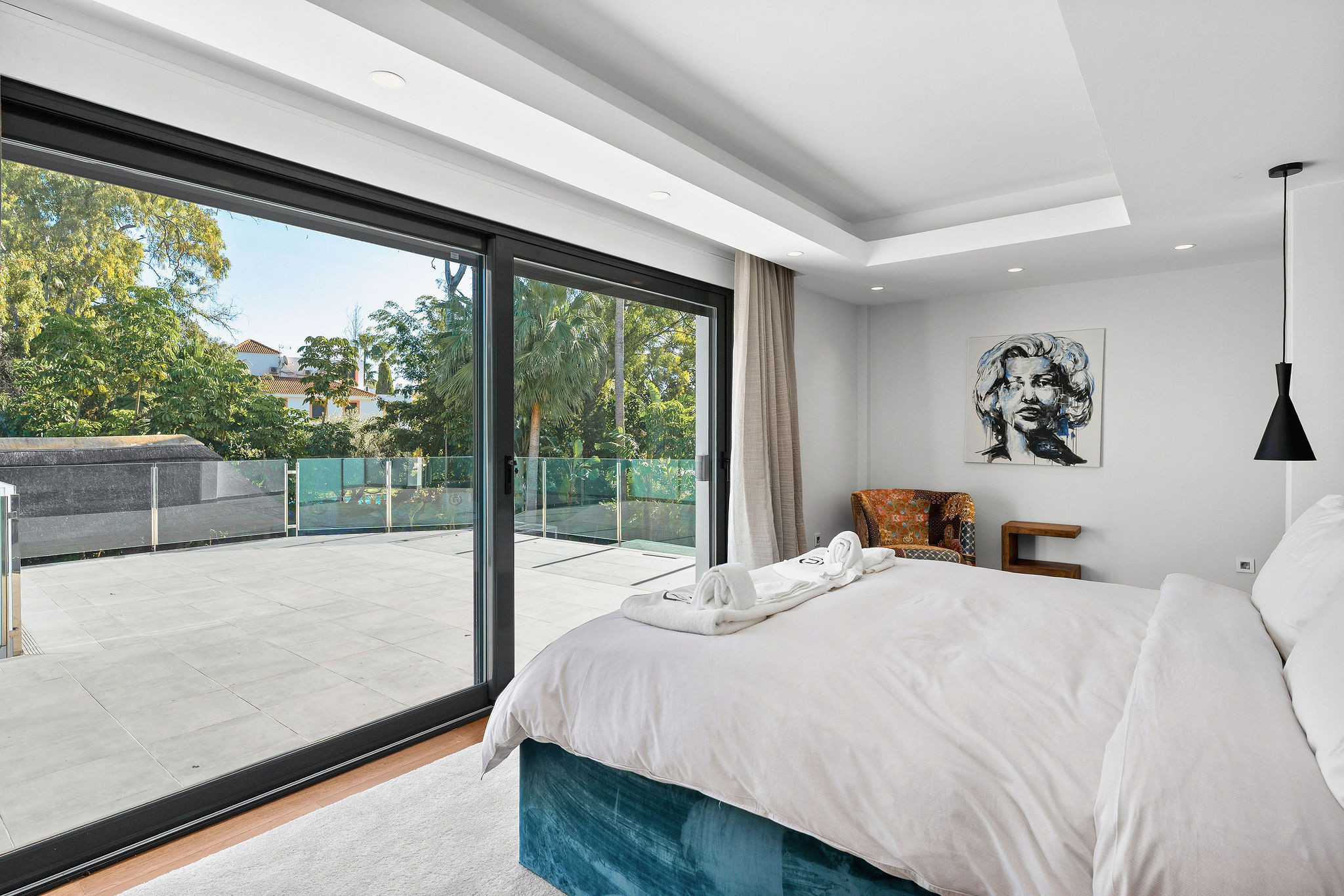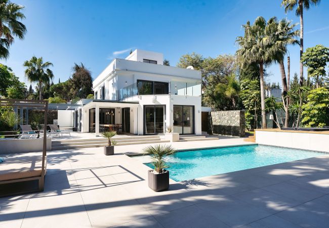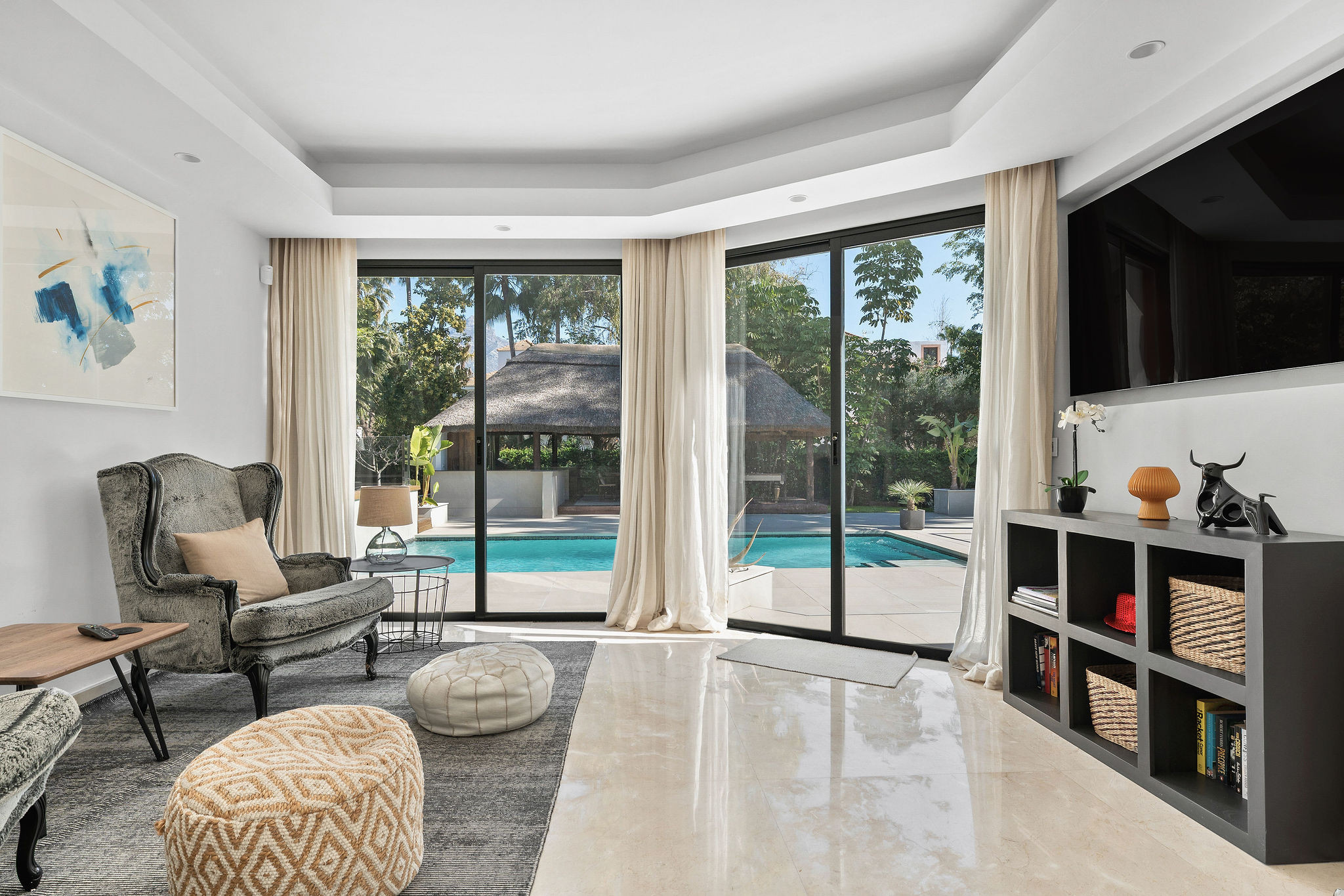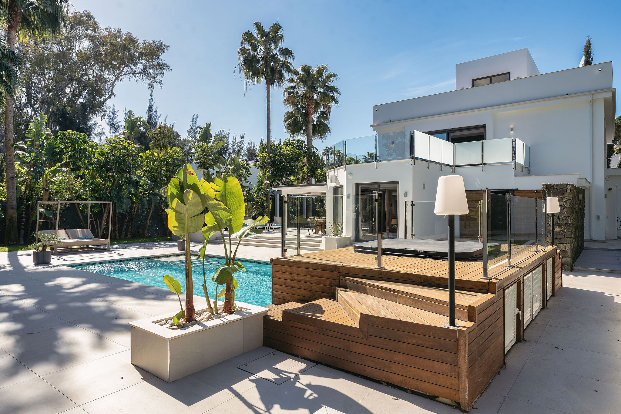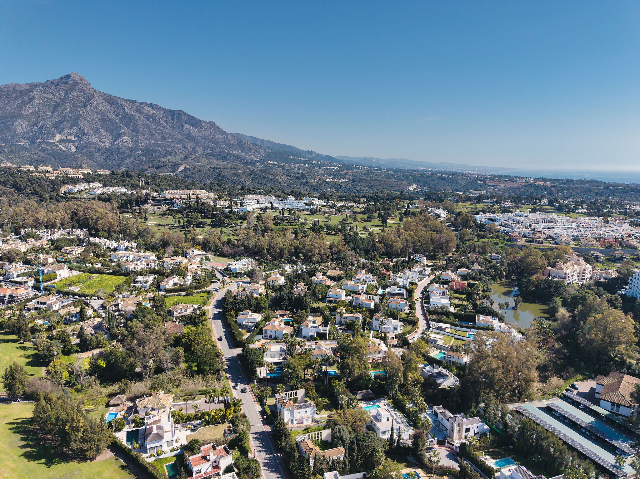 Vorstellung von Villa Las Brisas, eine raffinierte 5-Schlafzimmer-Residenz im zeitgenössischen Stil, bei der klare architektonische Linien auf entspannte mediterrane Eleganz treffen, perfekt gelegen im Herzen von Nueva Andalucía, nur wenige Schritte vom Los Naranjos Golfclub entfernt. Diese renommierte Gegend ist bekannt für ihre üppigen grünen Fairways, Golf auf Weltklasseniveau und einen lebendigen Lebensstil mit gehobener Gastronomie, Boutique-Shopping und einfachem Zugang zu Marbellas goldenen Stränden. Hier zu leben verbindet Ruhe, Luxus und Bequemlichkeit in einer der begehrtesten Ecken der Costa del Sol.