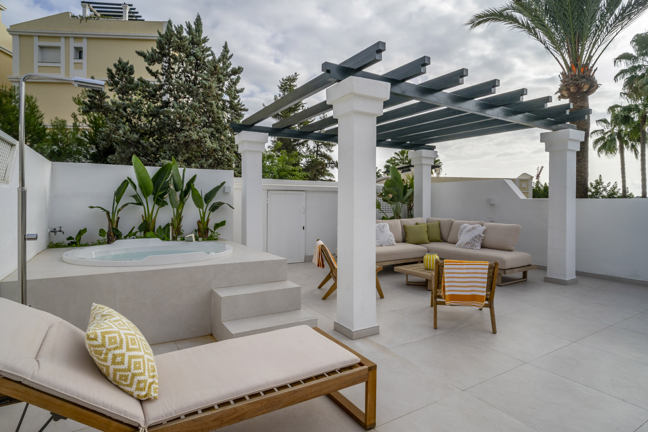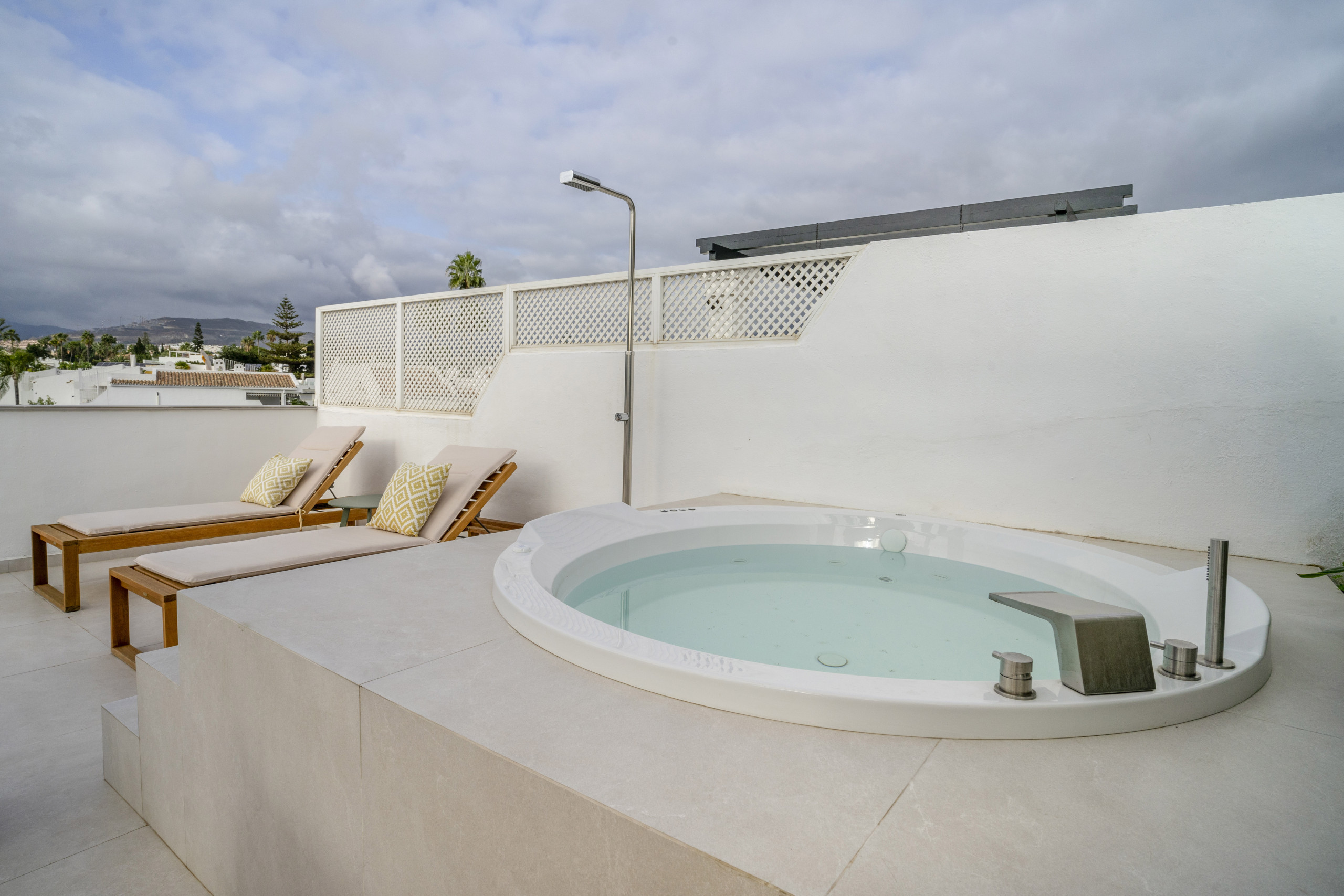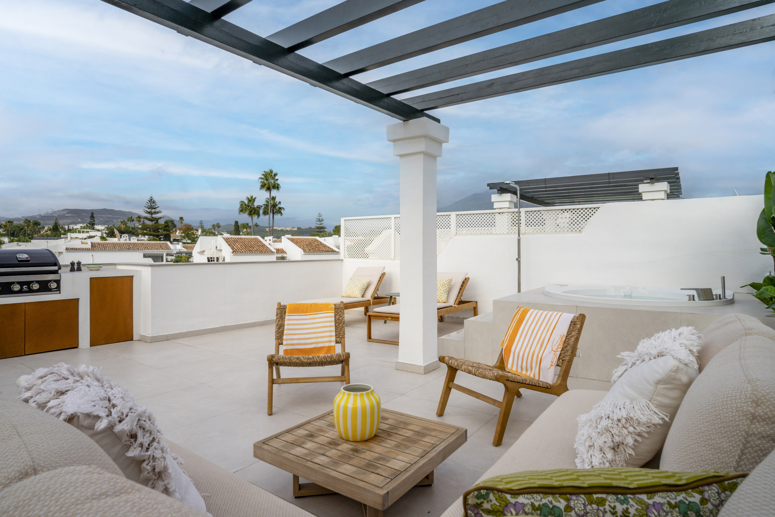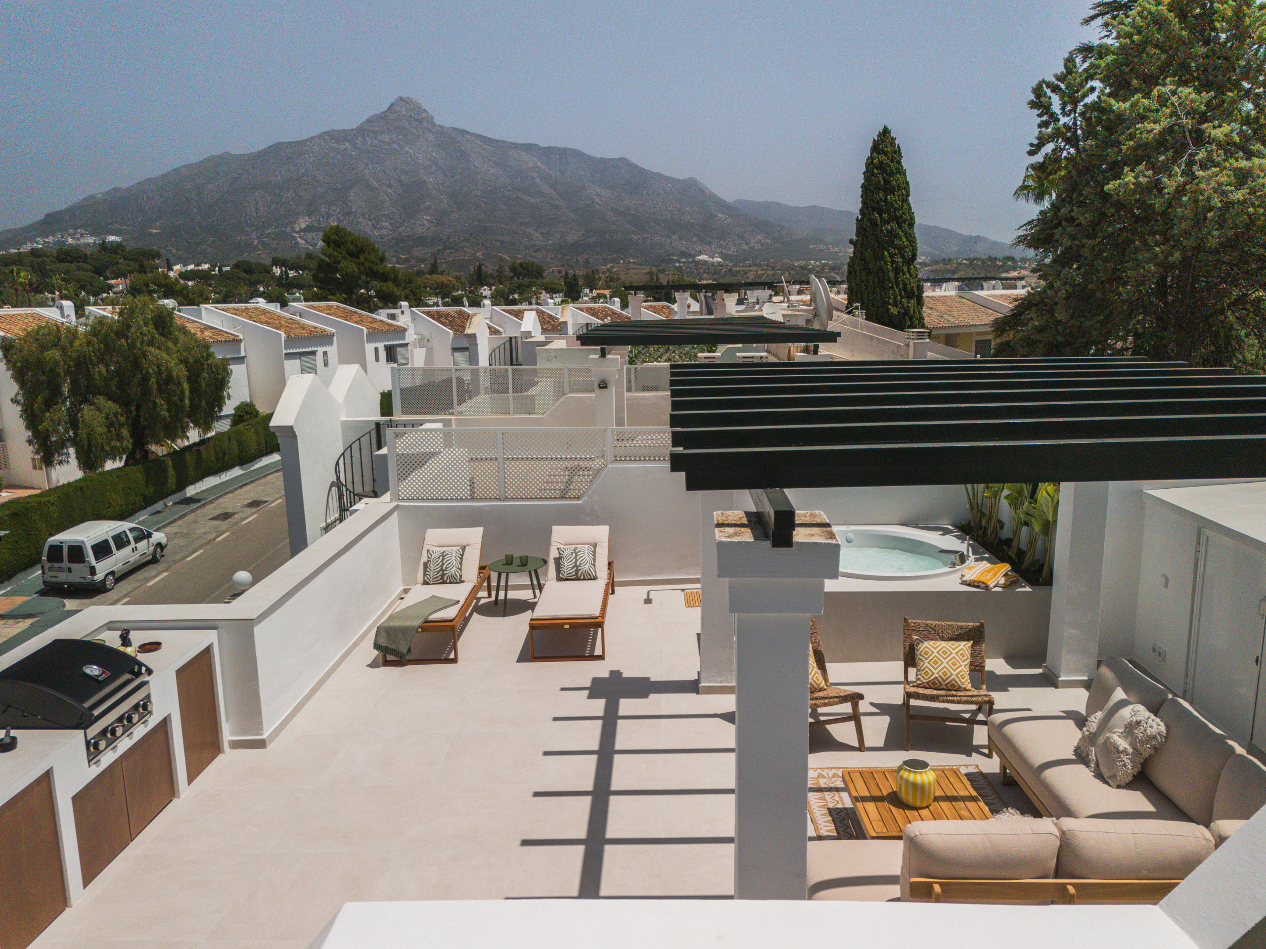 Desde el salón, salga a la terraza donde podrá disfrutar de la comida al aire libre y del maravilloso clima de Marbella durante todo el año. En la planta superior, la terraza privada en la azotea ofrece un impresionante espacio adicional con una acogedora zona de estar, tumbonas para relajarse bajo el sol mediterráneo, una zona de barbacoa y un lujoso jacuzzi, perfecto para desconectar en casa.