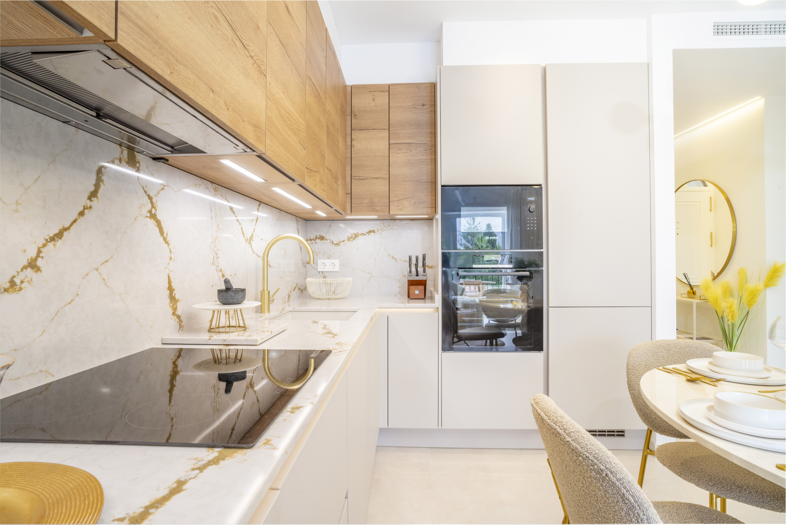 En el interior, el ático cuenta con un diseño moderno y elegante con acabados de alta calidad en todo el espacio. La cocina de líneas limpias y el área de comedor fluyen perfectamente hacia una sala de estar con estilo, creando un espacio cómodo e invitador para la vida diaria y el entretenimiento.