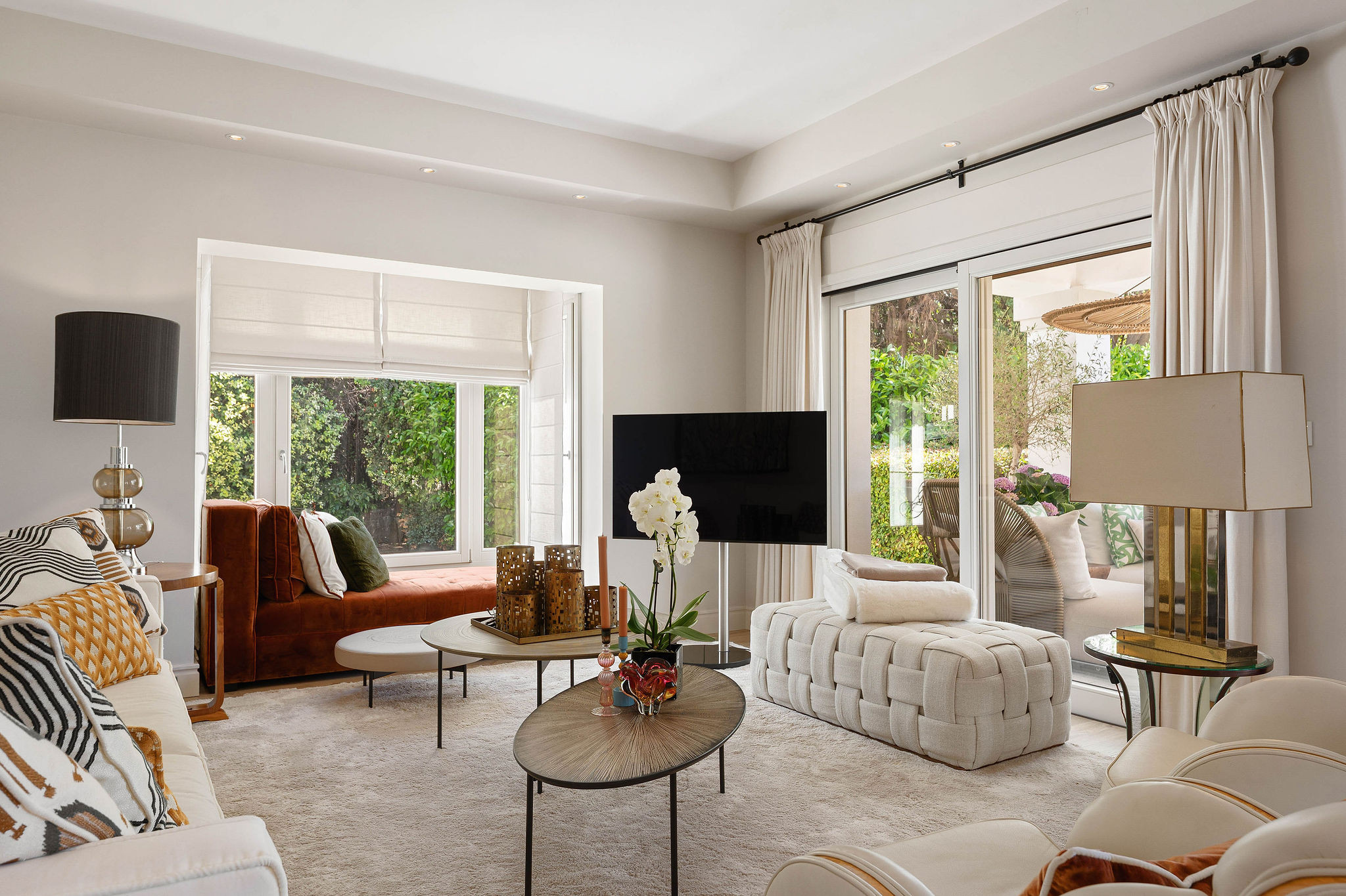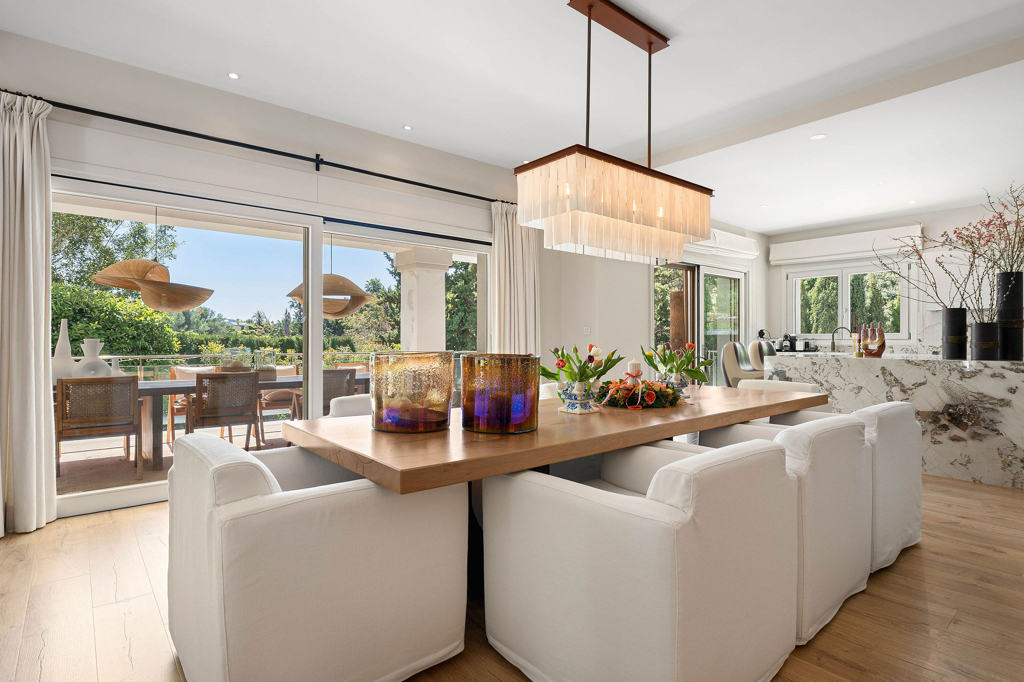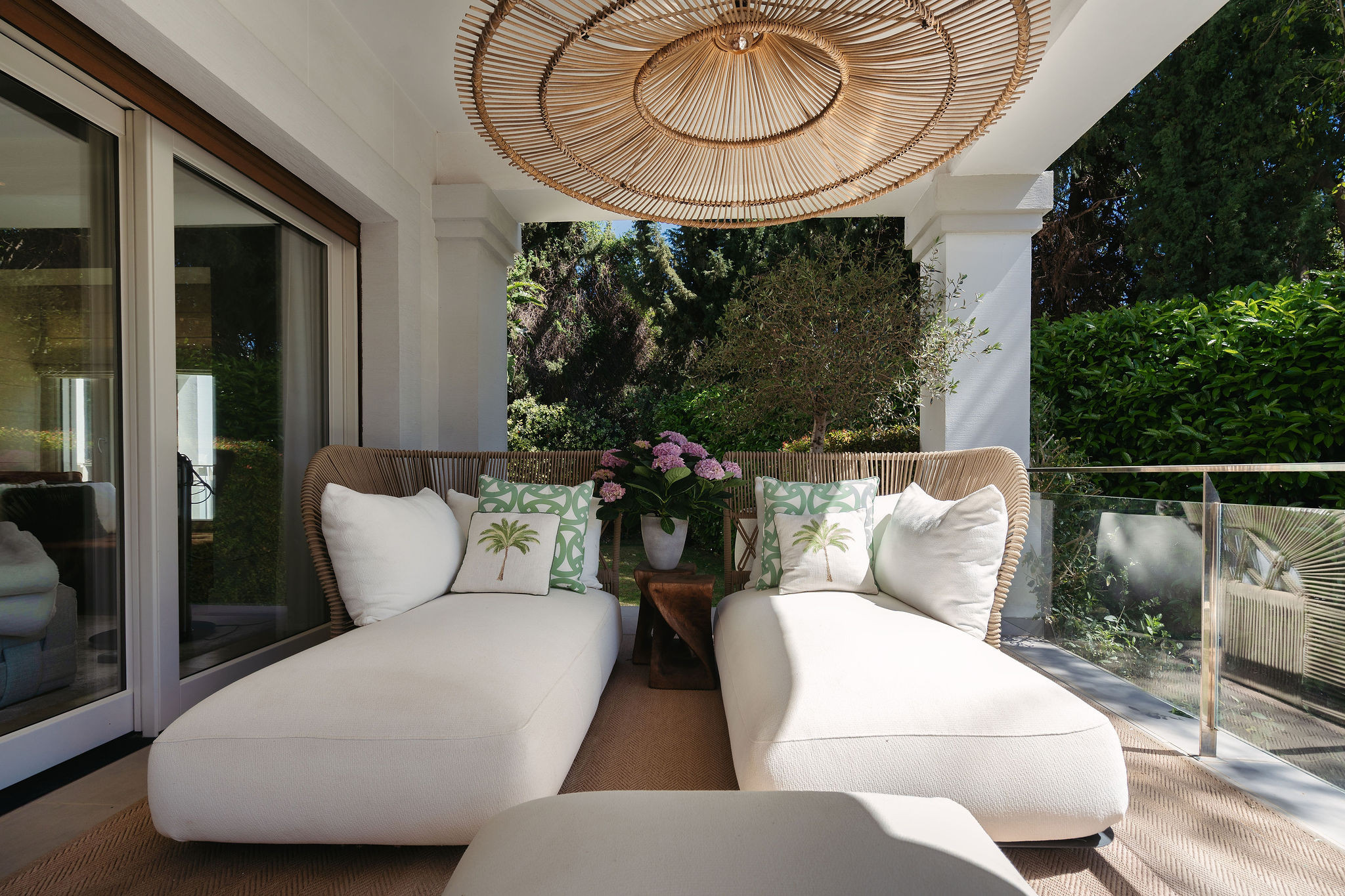 Desde la zona de estar, accede a la amplia terraza, ideal para recibir invitados o simplemente disfrutar del sol de Marbella. Aquí encontrarás una generosa mesa de comedor, una elegante zona de descanso perfecta para relajarse con un libro, y una hermosa piscina que ofrece un refugio refrescante en los días cálidos.