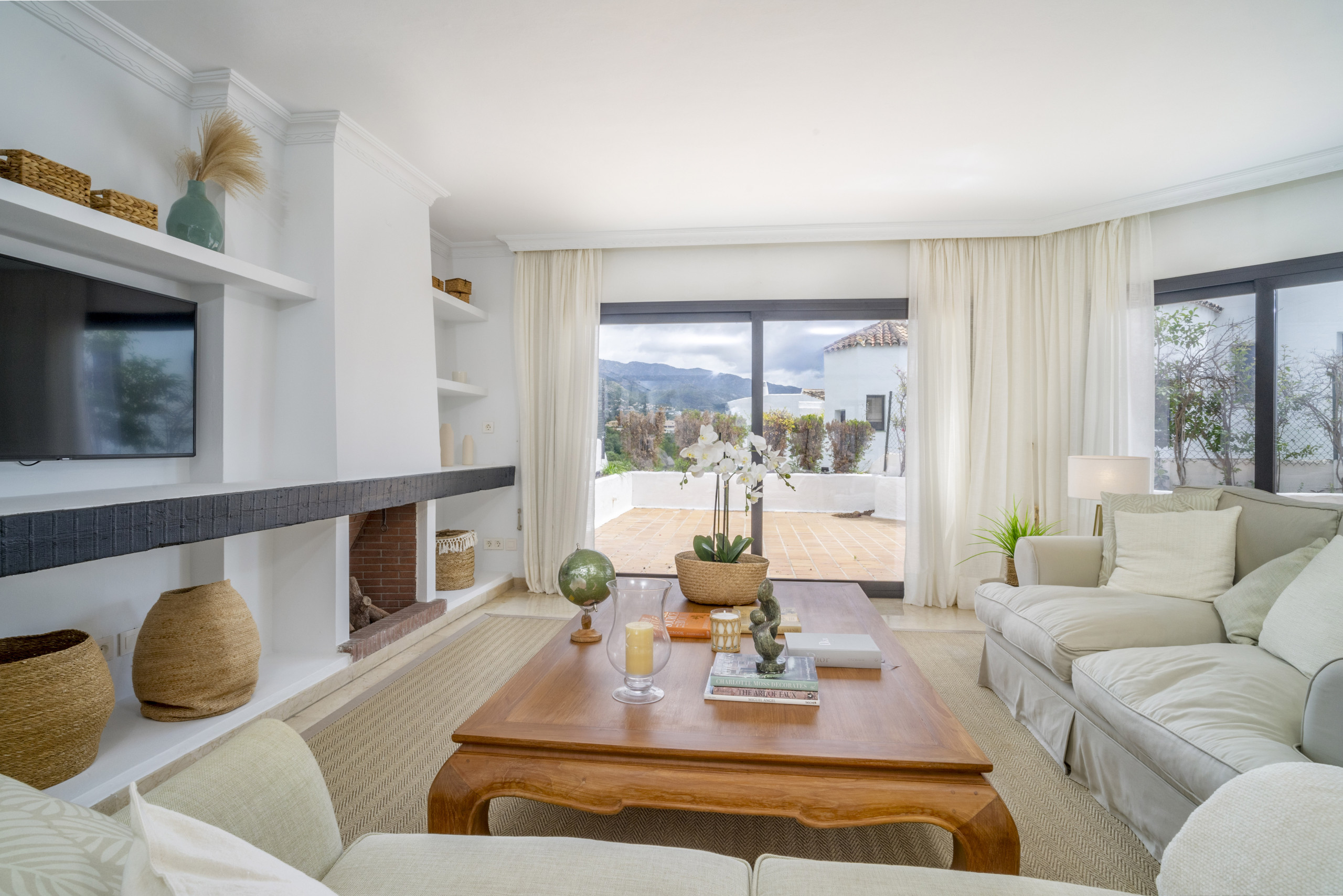 Cuenta con muebles nuevos que dan a la propiedad un ambiente fresco y muy moderno. El salón-comedor de planta abierta ofrece mucho espacio para relajarse con un cómodo sofá de esquina, chimenea y espacio para comer para 6 personas. Hay acceso directo desde aquí a la terraza que ofrece zonas de comedor y relax con vistas a los exóticos jardines comunitarios.