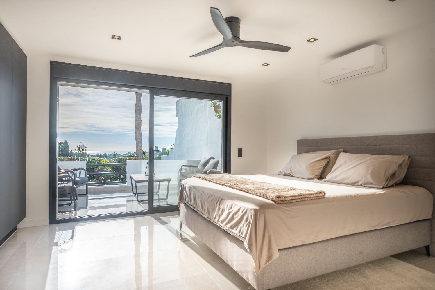 El área de estar tiene puertas plegables amplias que crean una vida interior-exterior perfectamente integrada. La terraza es simplemente increíble, ofreciendo áreas tanto cubiertas como abiertas para relajarse y disfrutar del sol. Disfrute de largas tardes de verano con una barbacoa, cene al aire libre, o relájese en el sofá exterior y la cama de día mientras absorbe el estilo de vida mediterráneo.