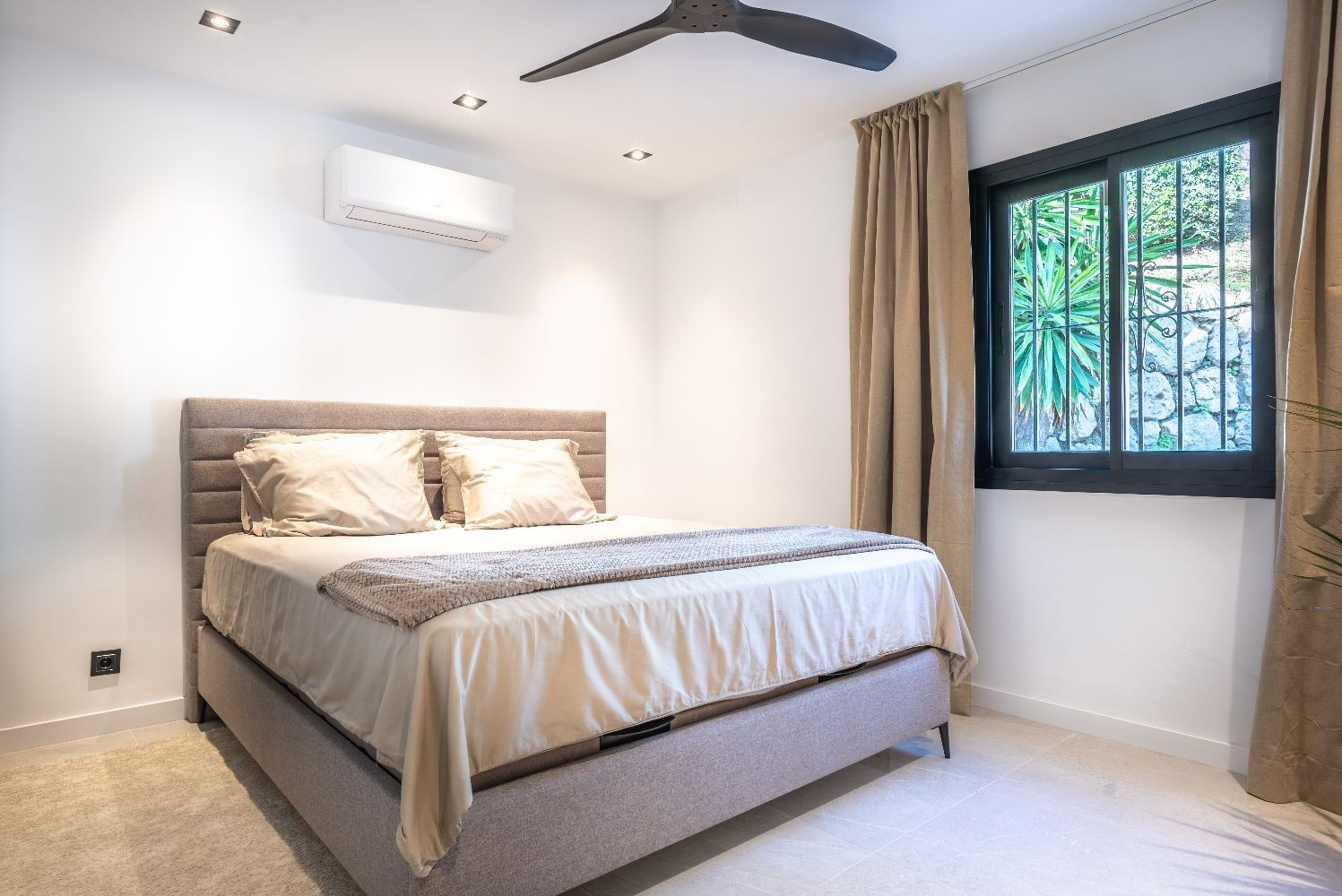 Al entrar, un encantador patio privado marca el tono. En el interior, la cocina moderna de planta abierta se integra perfectamente con el área de estar y comedor. También hay una habitación adicional conveniente con dos camas individuales en este nivel, ideal para niños o invitados (sin aire acondicionado en esta habitación, solo en la sala de estar, pero se proporcionan ventiladores silenciosos), y un tercer baño con ducha de paseo.
