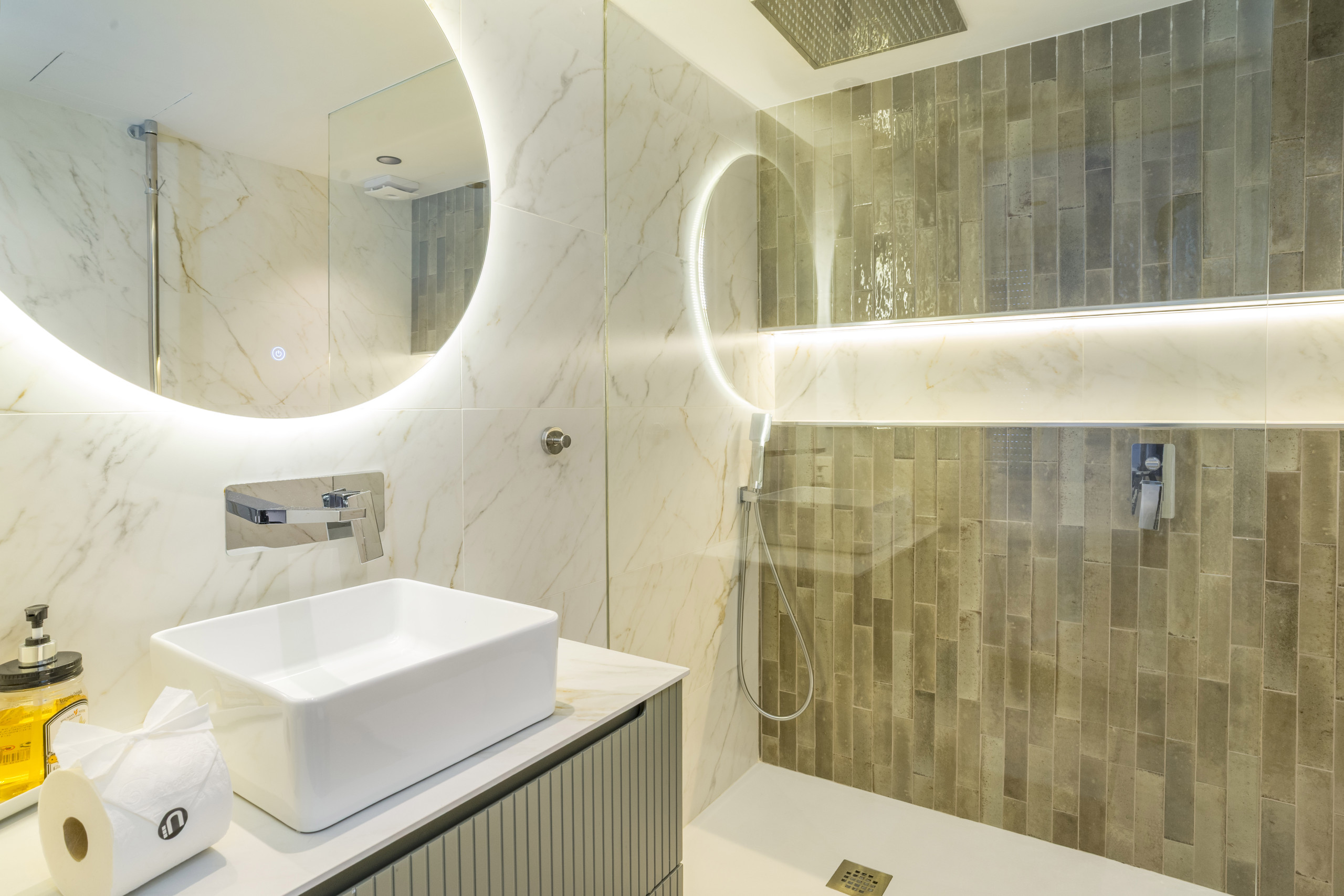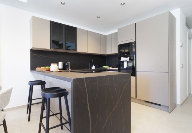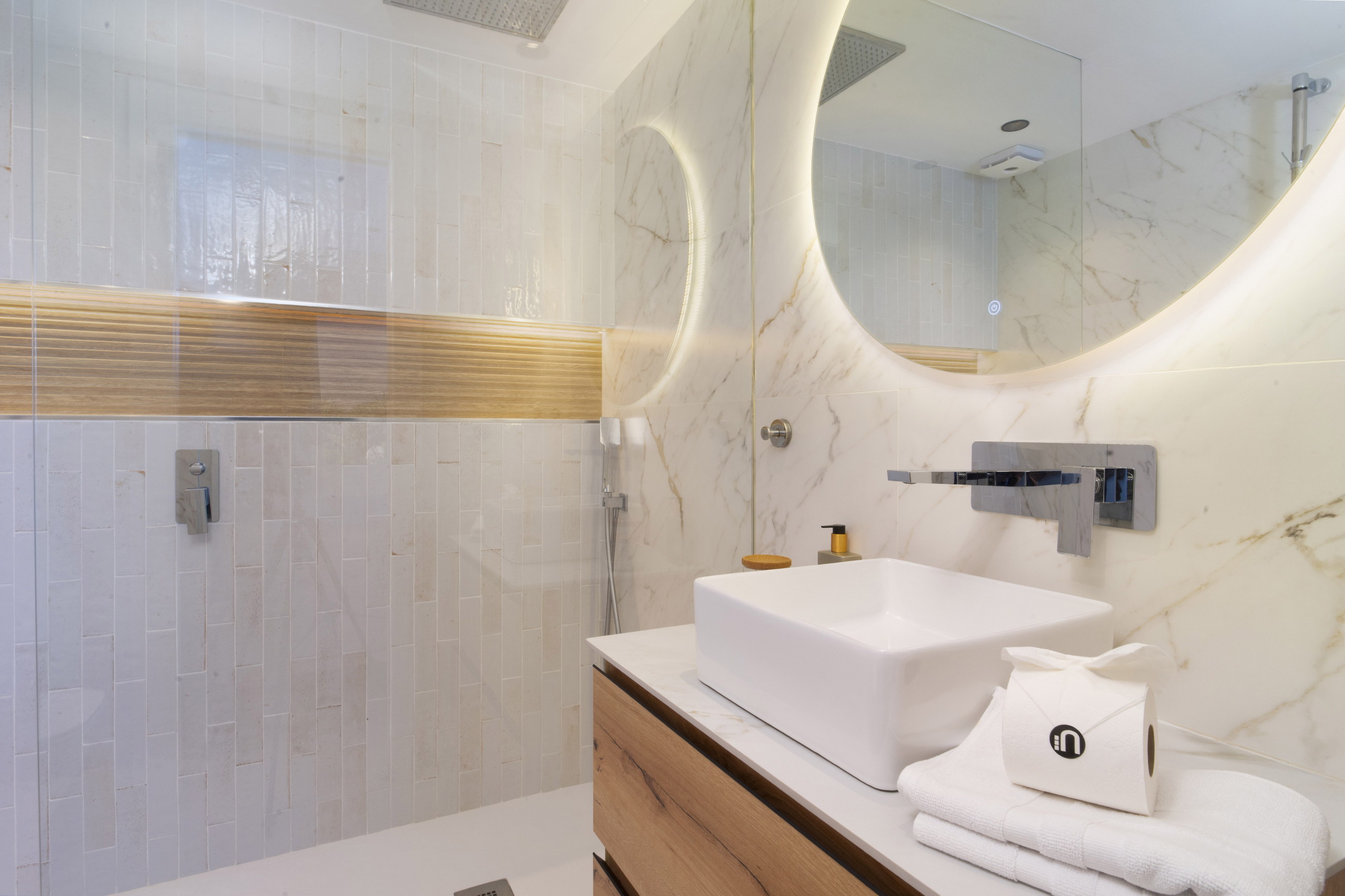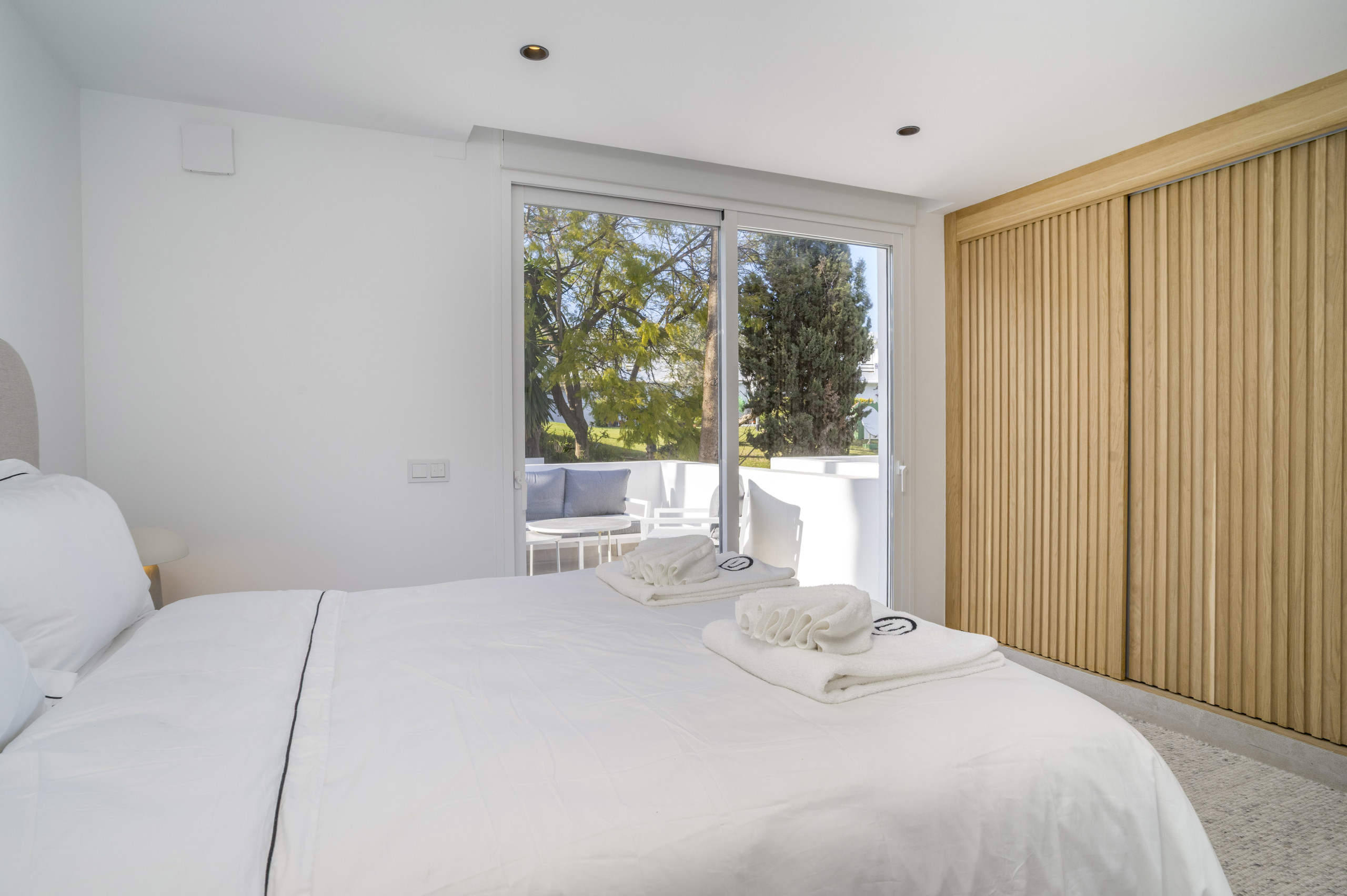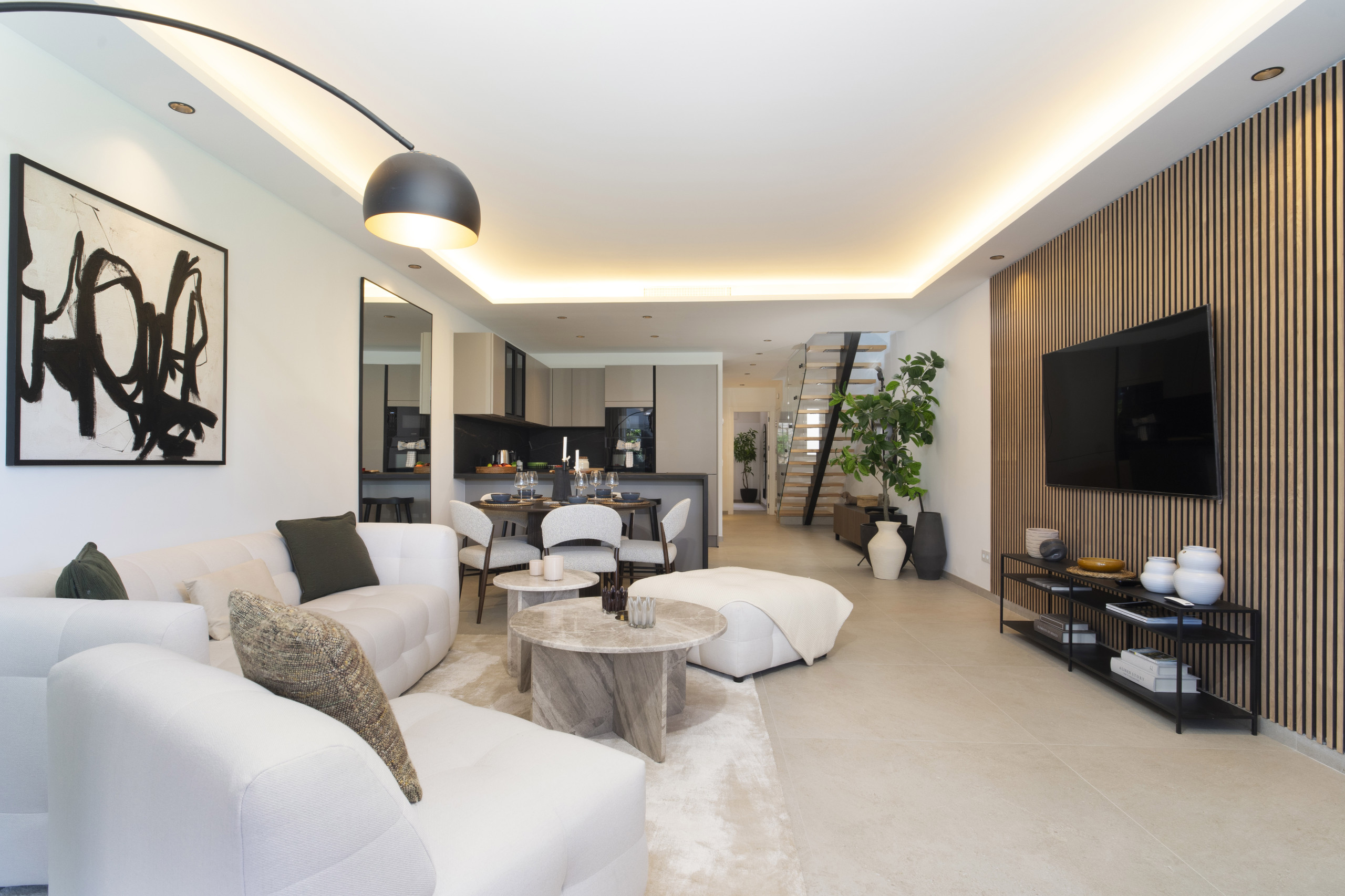 En entrant, une terrasse privée charmante donne le ton. À l'intérieur, la cuisine moderne à plan ouvert se fond harmonieusement avec le salon et la salle à manger. Il y a aussi une chambre supplémentaire pratique avec deux lits simples à ce niveau, idéale pour les enfants ou les invités (pas de climatisation dans cette chambre, uniquement dans le salon, mais des ventilateurs silencieux sont fournis), et une troisième salle de bain avec douche à l'italienne.