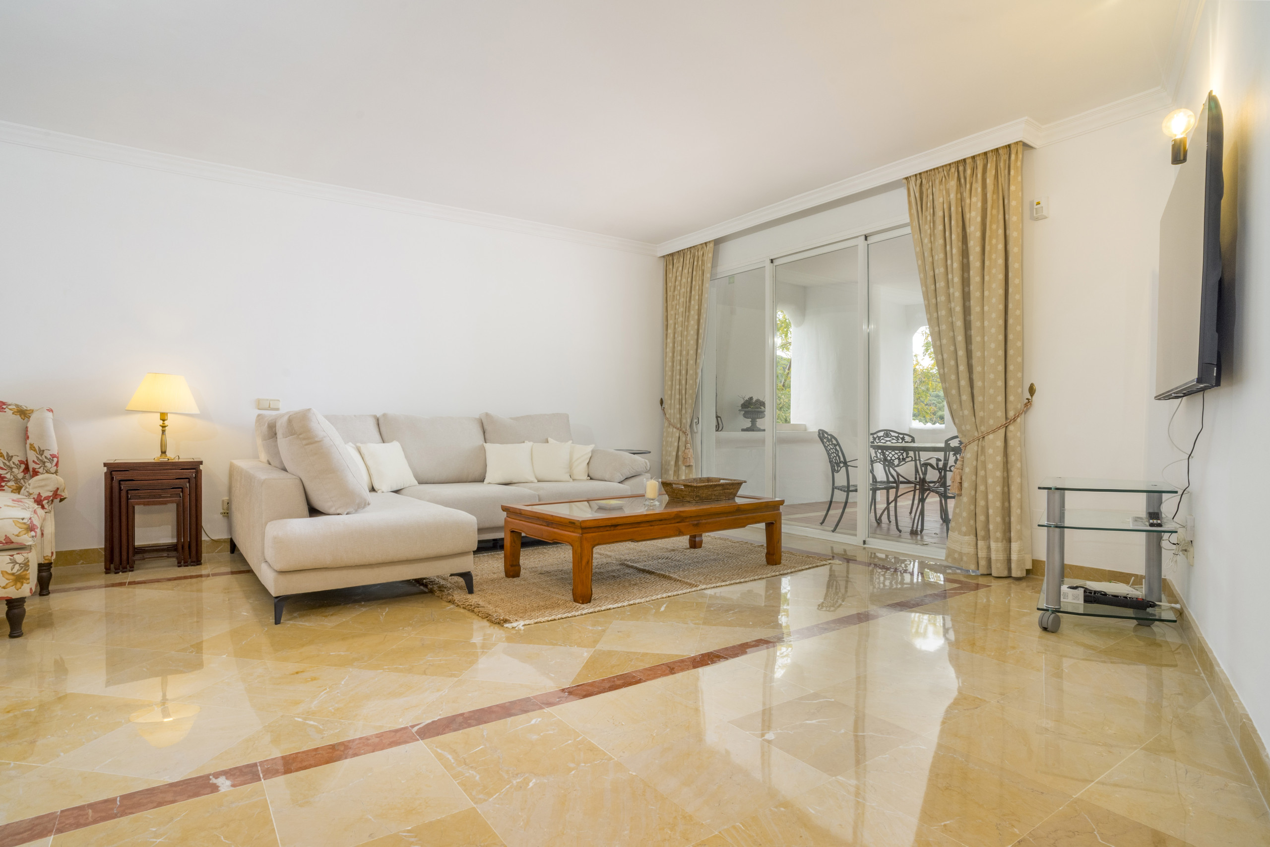 L'appartement dispose d'un spacieux et lumineux salon-salle à manger, parfaitement connecté à une terrasse couverte—idéal pour se détendre ou recevoir tout en profitant de l'environnement de La Quinta. La cuisine indépendante est entièrement équipée et complétée par une buanderie séparée pour plus de commodité.
