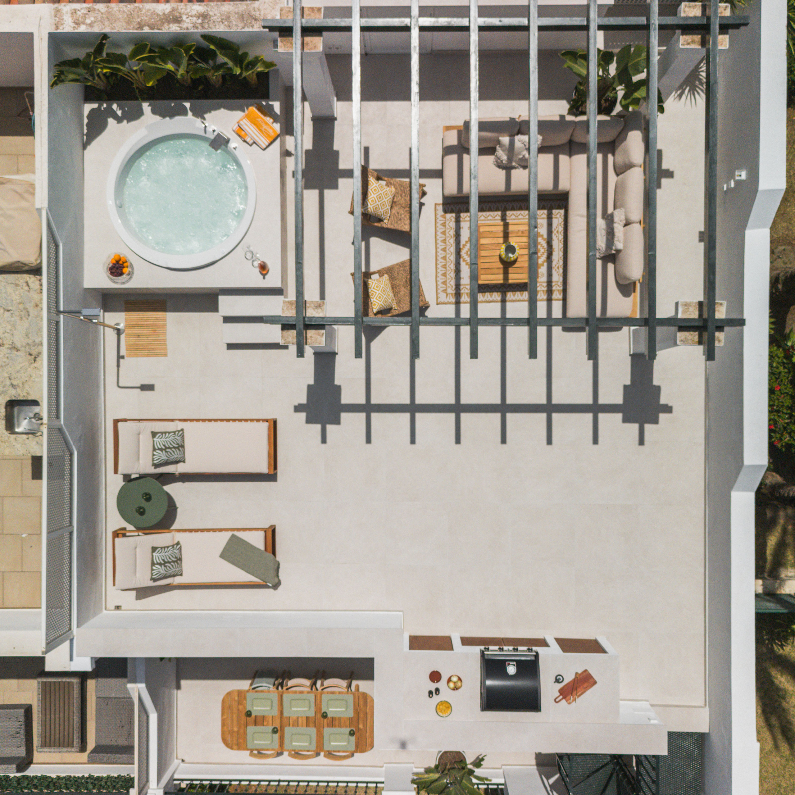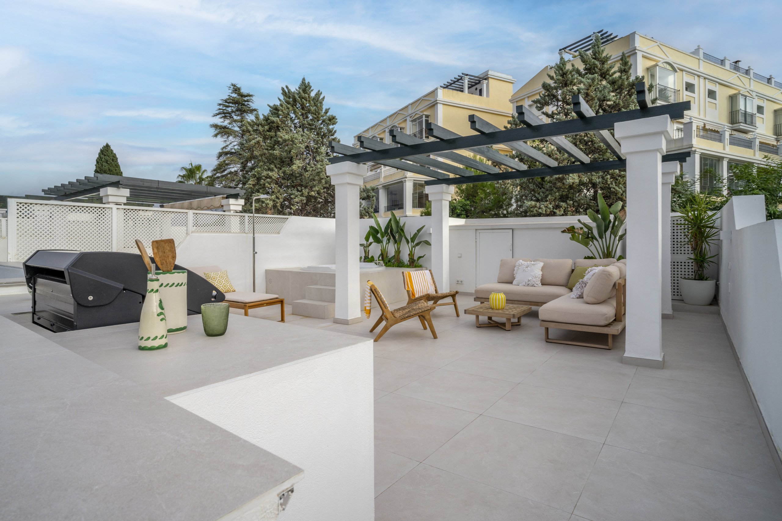 Du salon, sortez sur la terrasse où vous pouvez profiter des repas en plein air et du merveilleux climat de Marbella tout au long de l'année. À l'étage, la terrasse privée sur le toit offre un espace de vie supplémentaire impressionnant avec un coin salon confortable, des transats pour se détendre au soleil méditerranéen, une zone barbecue et un jacuzzi luxueux — parfait pour se détendre à la maison.