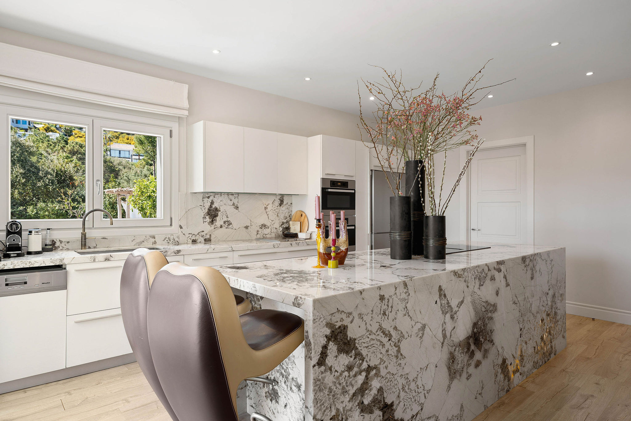 En entrant au rez-de-chaussée, vous êtes accueilli par un magnifique hall d'entrée aux plafonds vertigineux qui donnent le ton au reste de la maison. Cela s'écoule sans interruption dans le salon, la salle à manger et la cuisine entièrement équipée, chacun orné de pièces de design distinctives qui élèvent l'atmosphère et rendent l'espace vraiment unique.