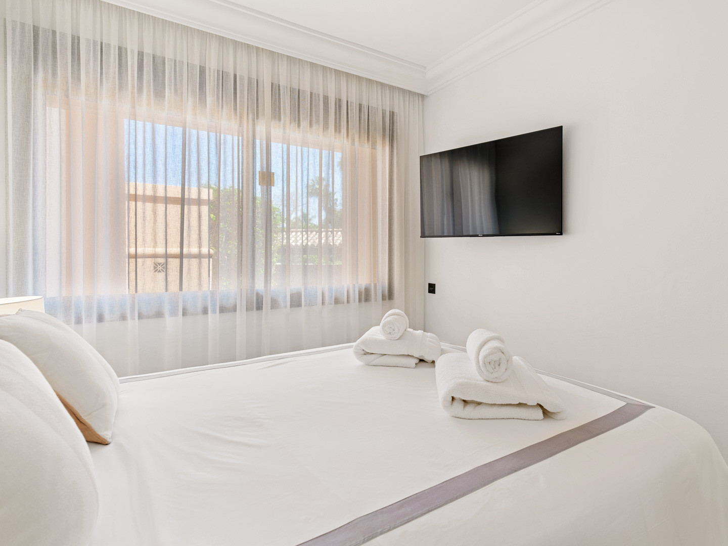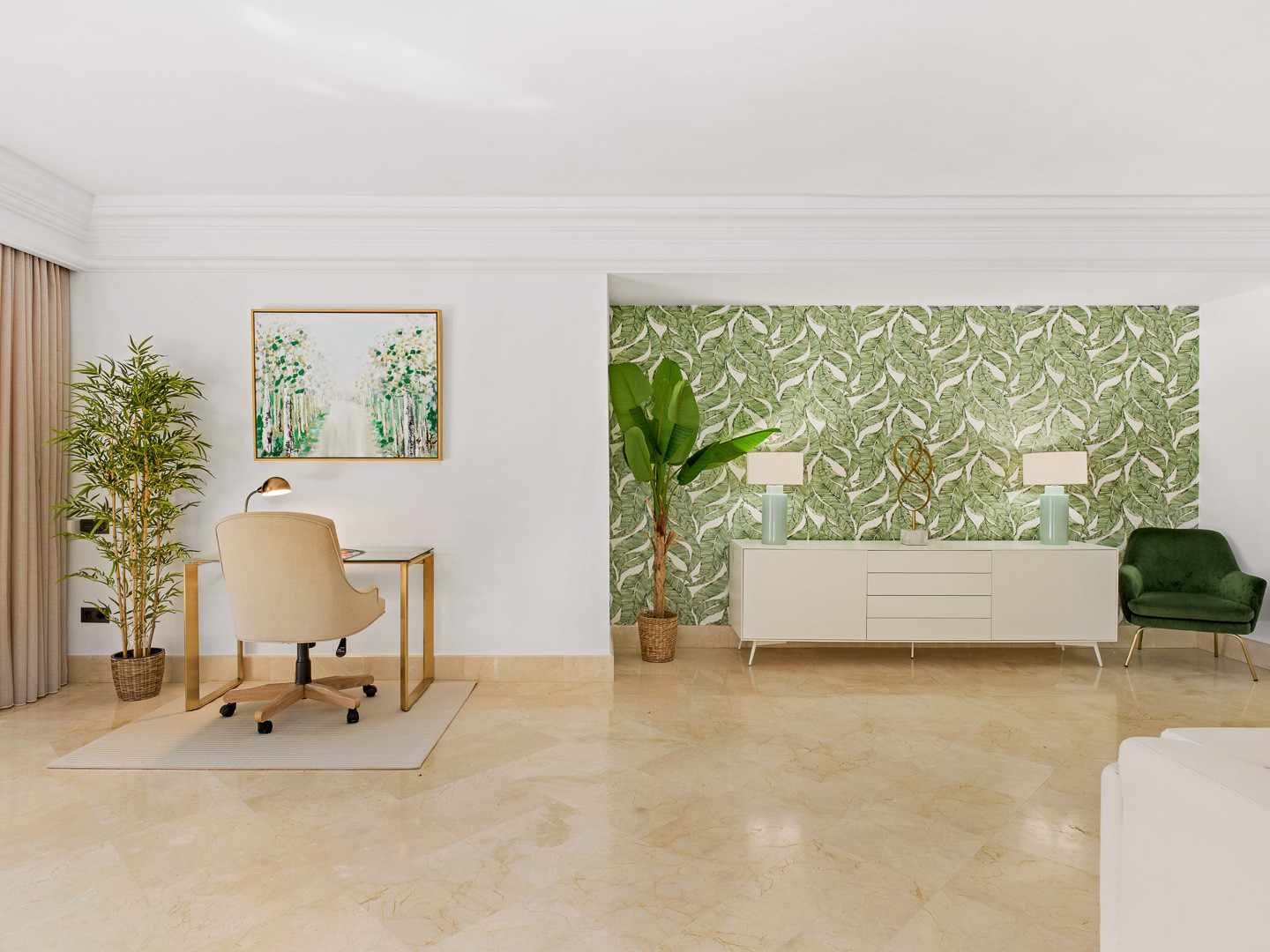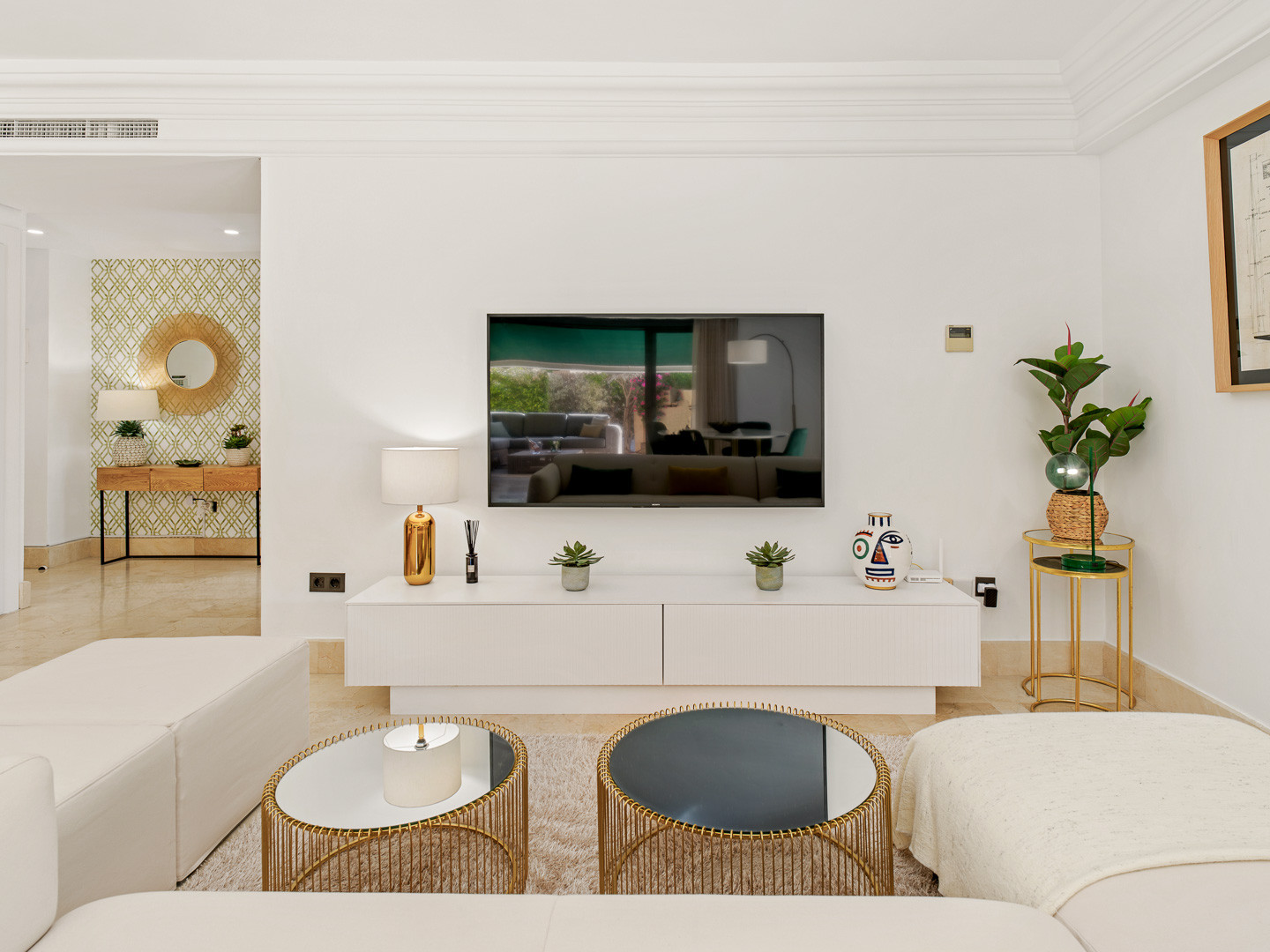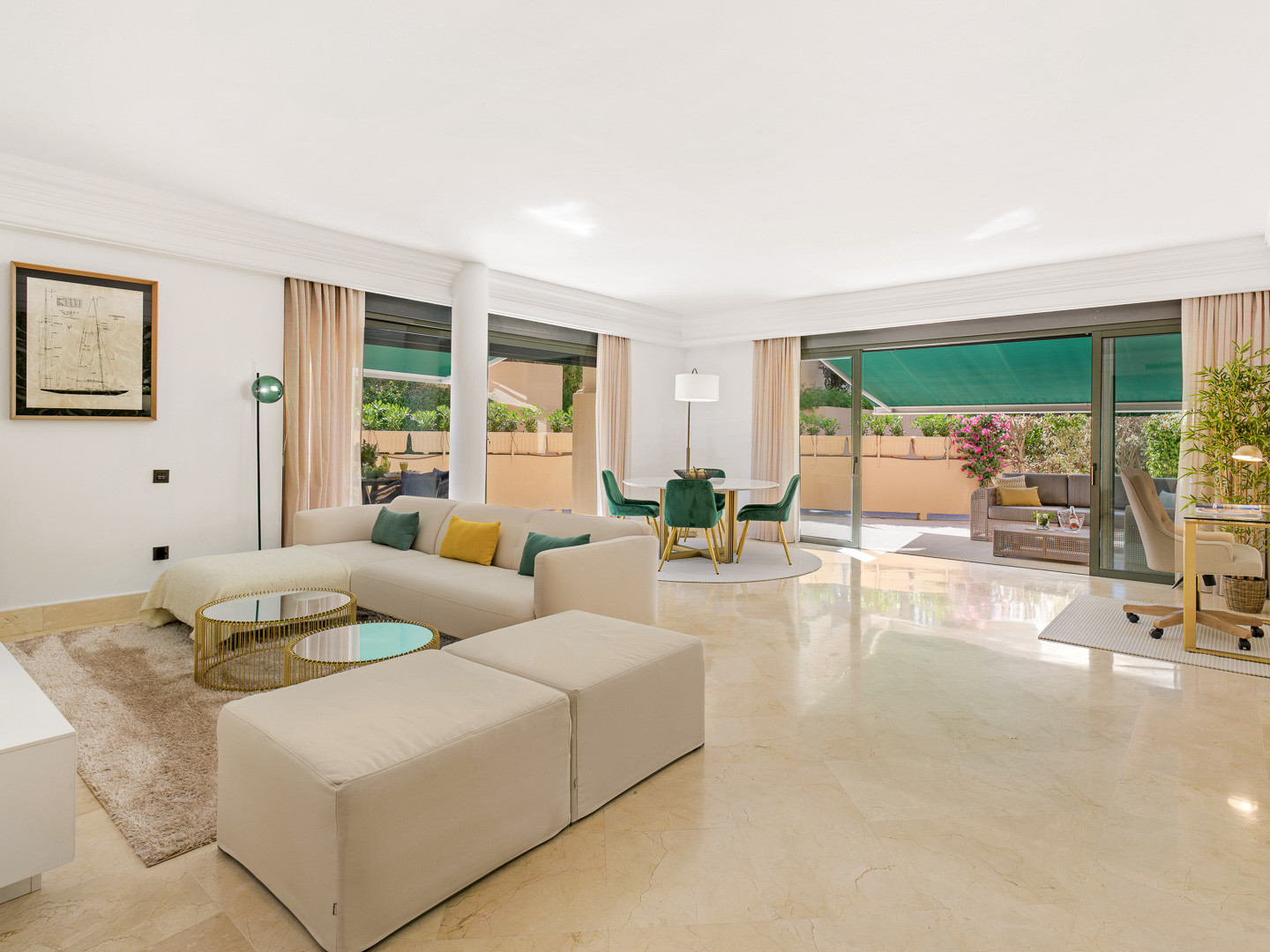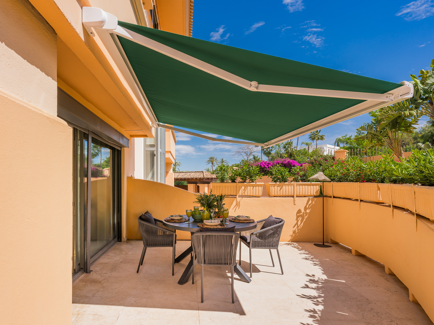 The apartment features a spacious living and dining area designed for both comfort and practicality, including a dedicated working space that makes it ideal for remote work. Large doors provide direct access to a private terrace, perfect for outdoor dining or enjoying Marbella’s year-round sunshine. The fully fitted kitchen includes a comfortable breakfast area, offering a functional and pleasant space for everyday living.