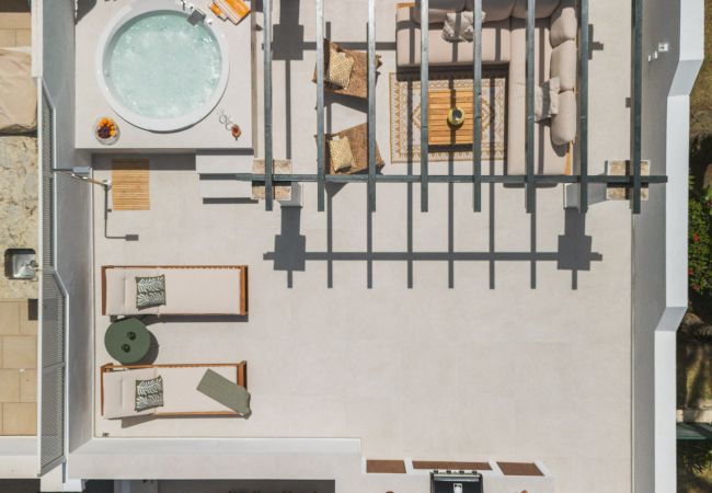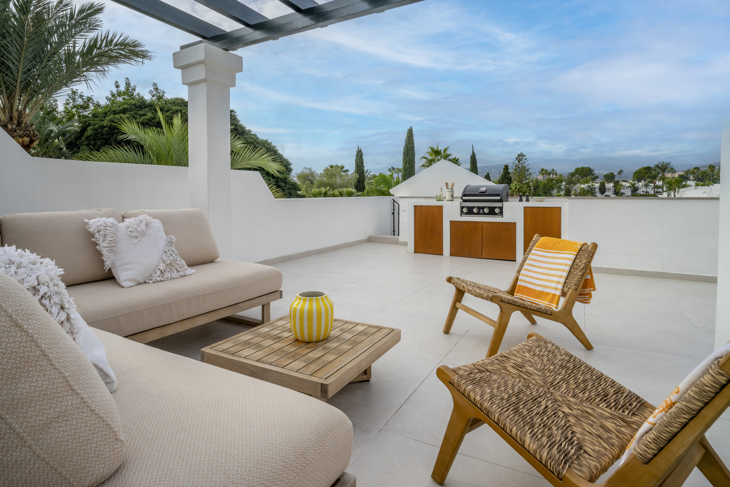 From the living room, step out onto the terrace where you can enjoy outdoor dining and Marbella’s wonderful climate throughout the year. Upstairs, the private rooftop terrace provides an impressive additional living space with a cosy lounge area, sunbeds for relaxing in the Mediterranean sun, a BBQ area, and a luxurious jacuzzi — perfect for unwinding at home.
