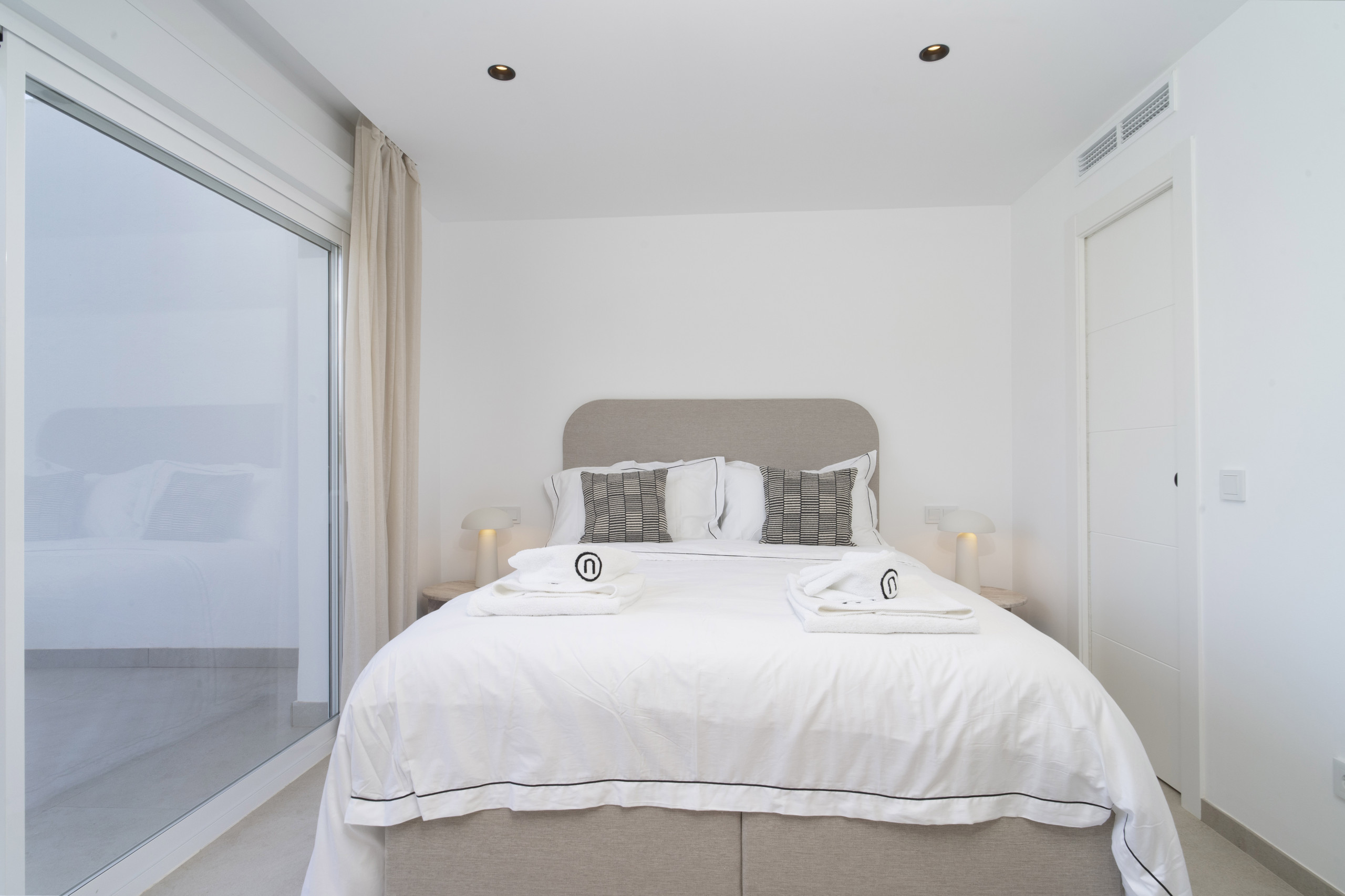 As you enter, a charming private patio sets the tone. Inside, the open-plan modern kitchen seamlessly blends with the living and dining area. There’s also a convenient extra bedroom with two single beds on this level, ideal for children or guests (no AC in this room, only living room, but quiet fans provided ), and a third bathroom with walk-in shower.