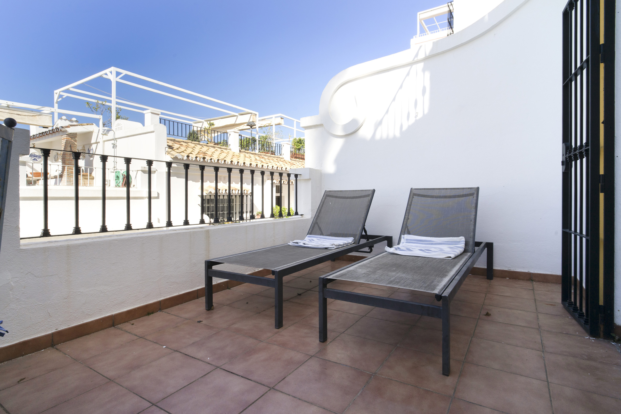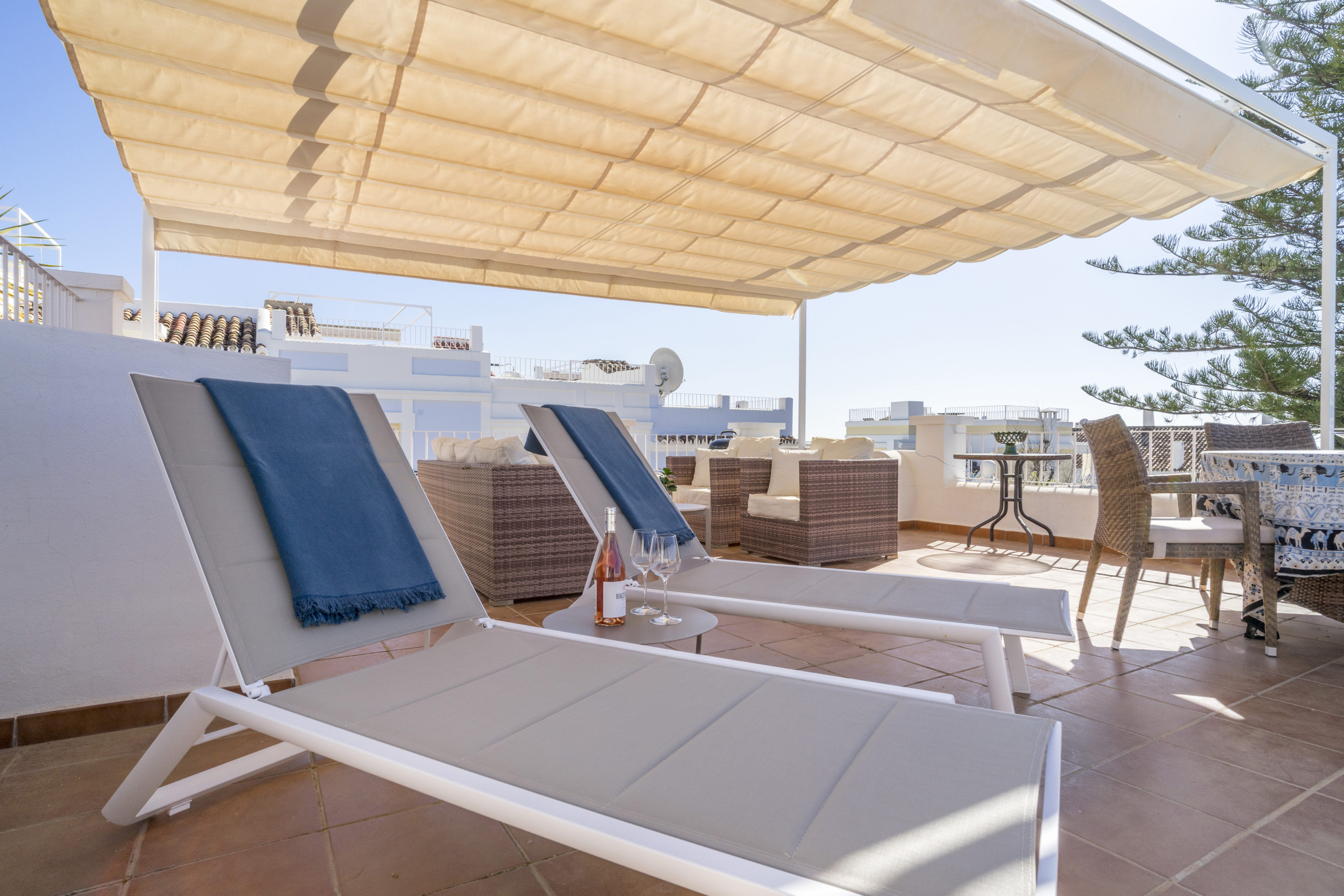 Ovanpå är takterrassen en verklig höjdpunkt. Här hittar du en stilfull loungearea med en pergola, bekväma soffor och solsängar, perfekt för att sola eller koppla av i skuggan med vänner och familj.