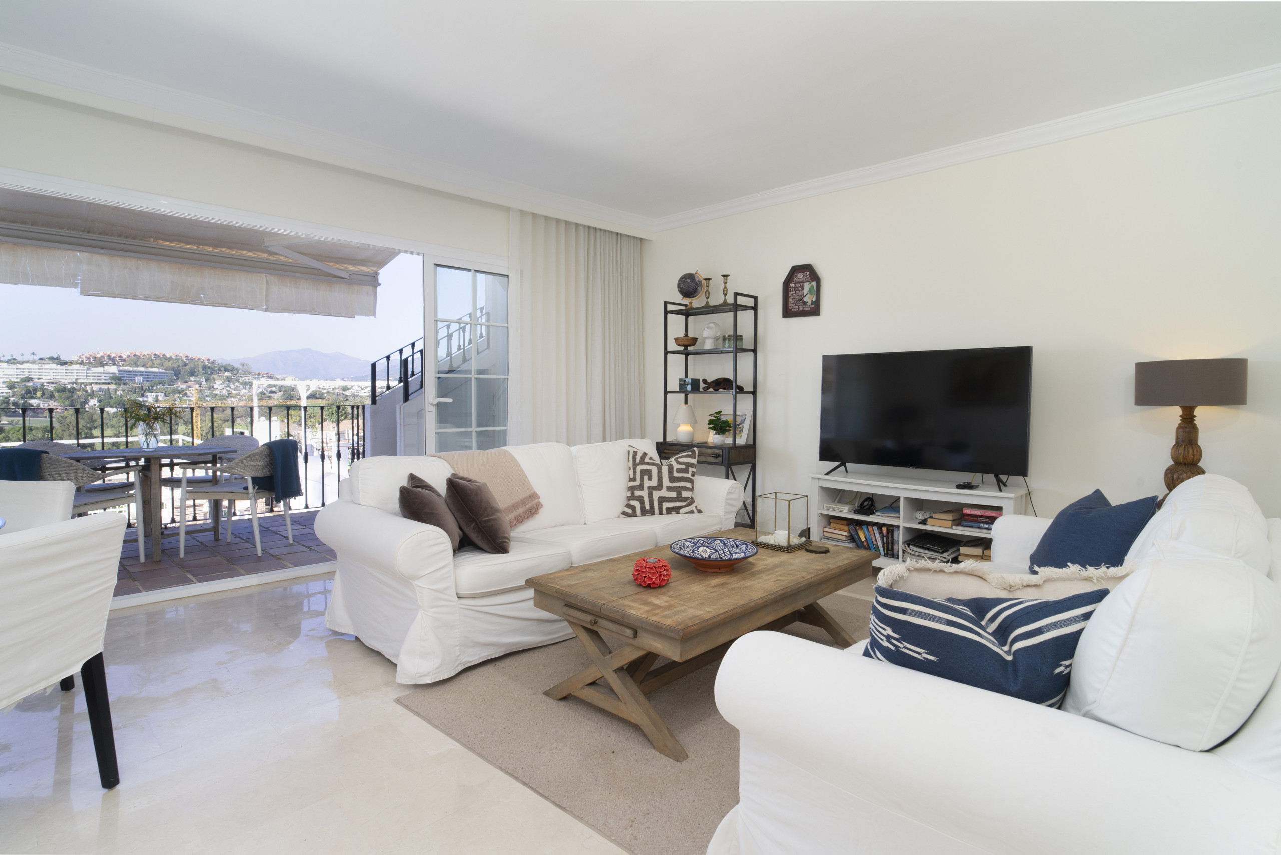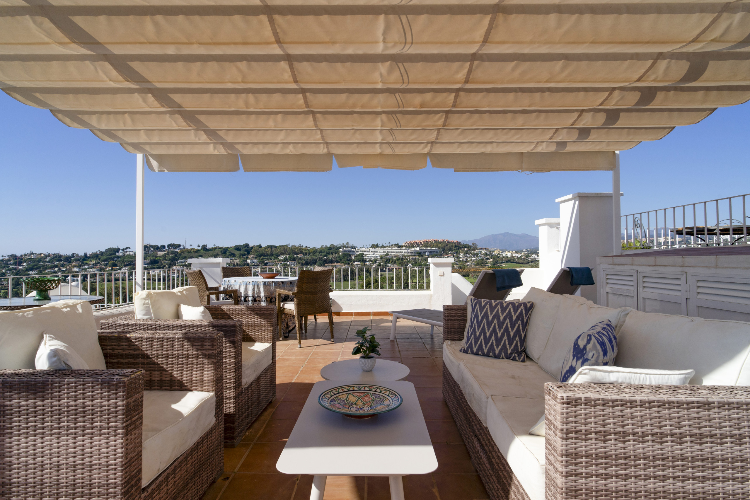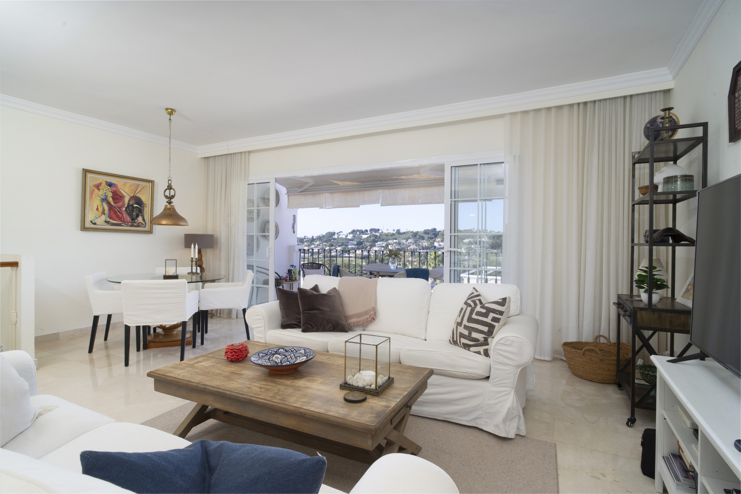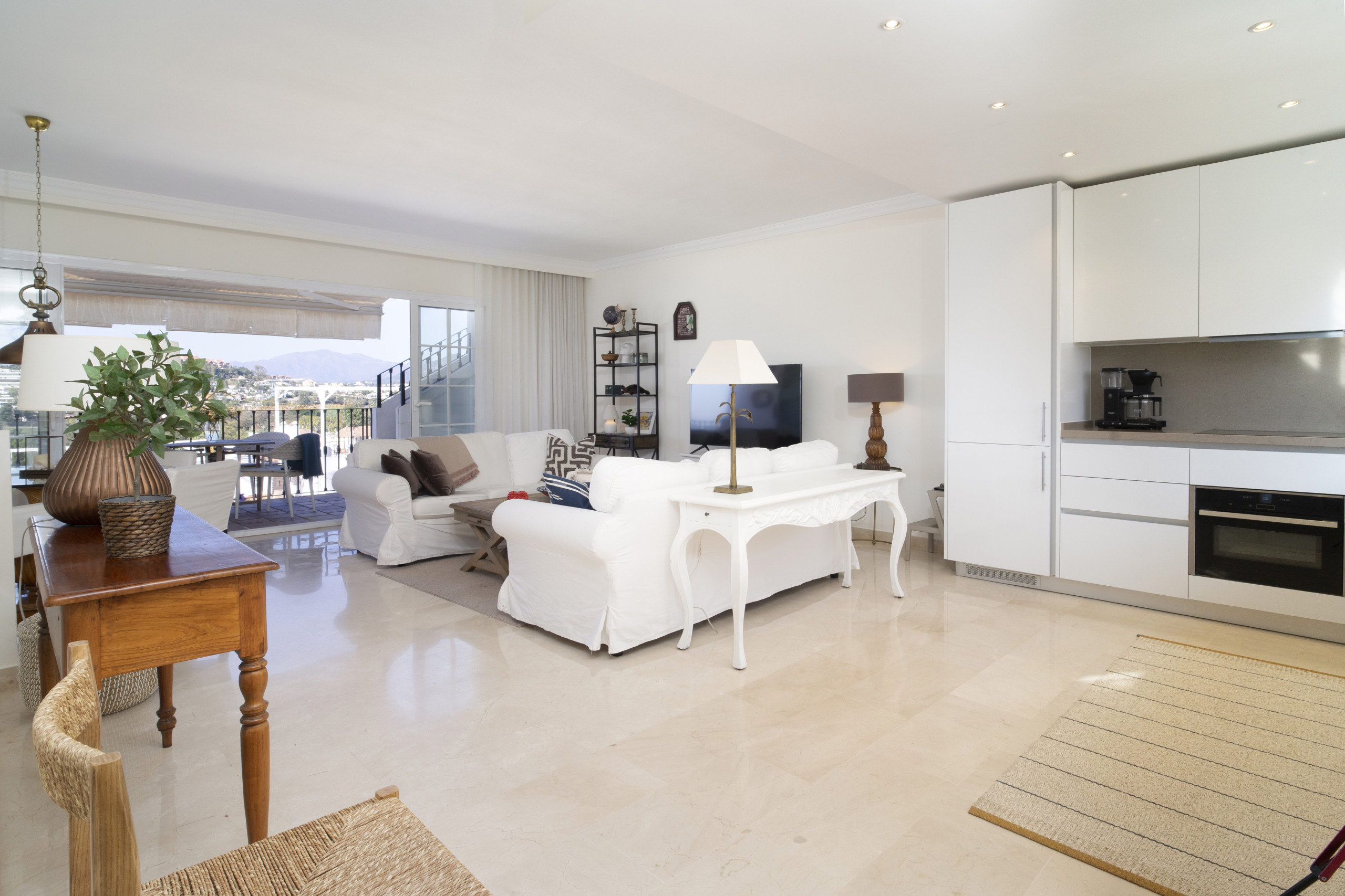 När du träder in i denna inbjudande hyreslägenheten välkomnas du av ett ljust och luftigt öppet planlösningsrum på första våningen. Stora fönster ramar in vackra vyer över Marbella, medan det öppna köket och vardagsrummet skapar den perfekta miljön för avslappnad inomhus-utomhus-vistelse. Glasdörrarna öppnas helt, vilket gör att du sömlöst kan förbinda interiören med den omgivande scenografin.