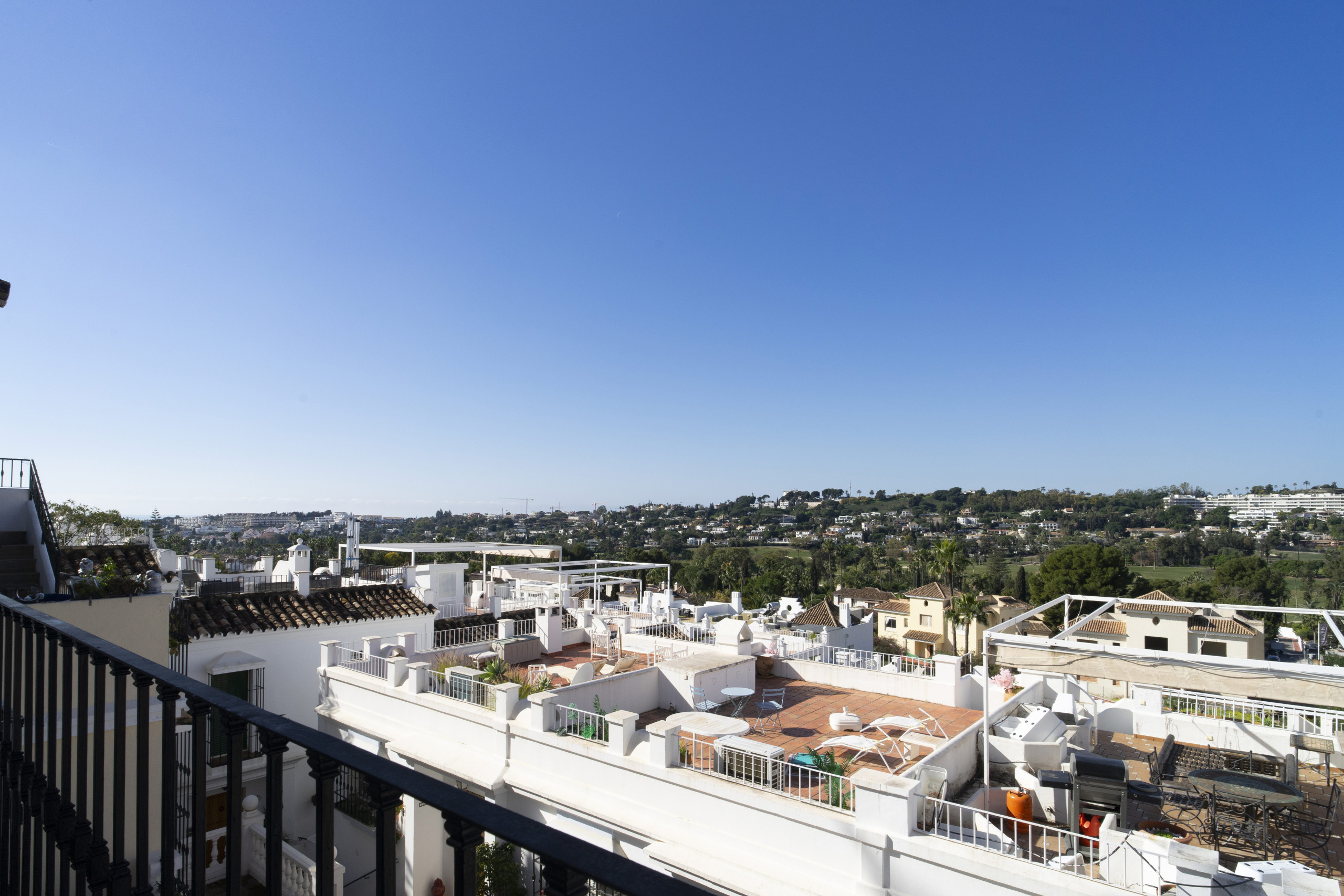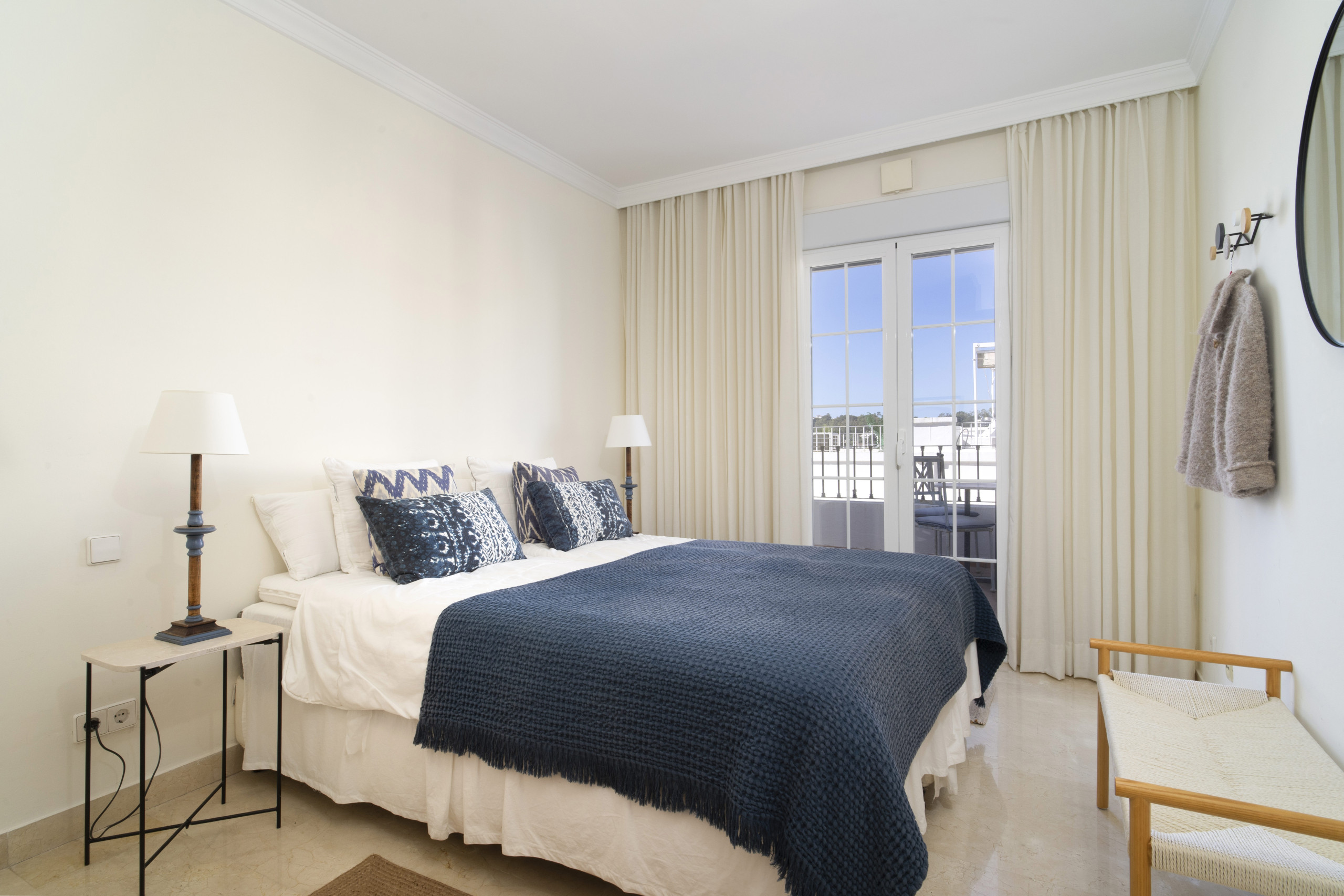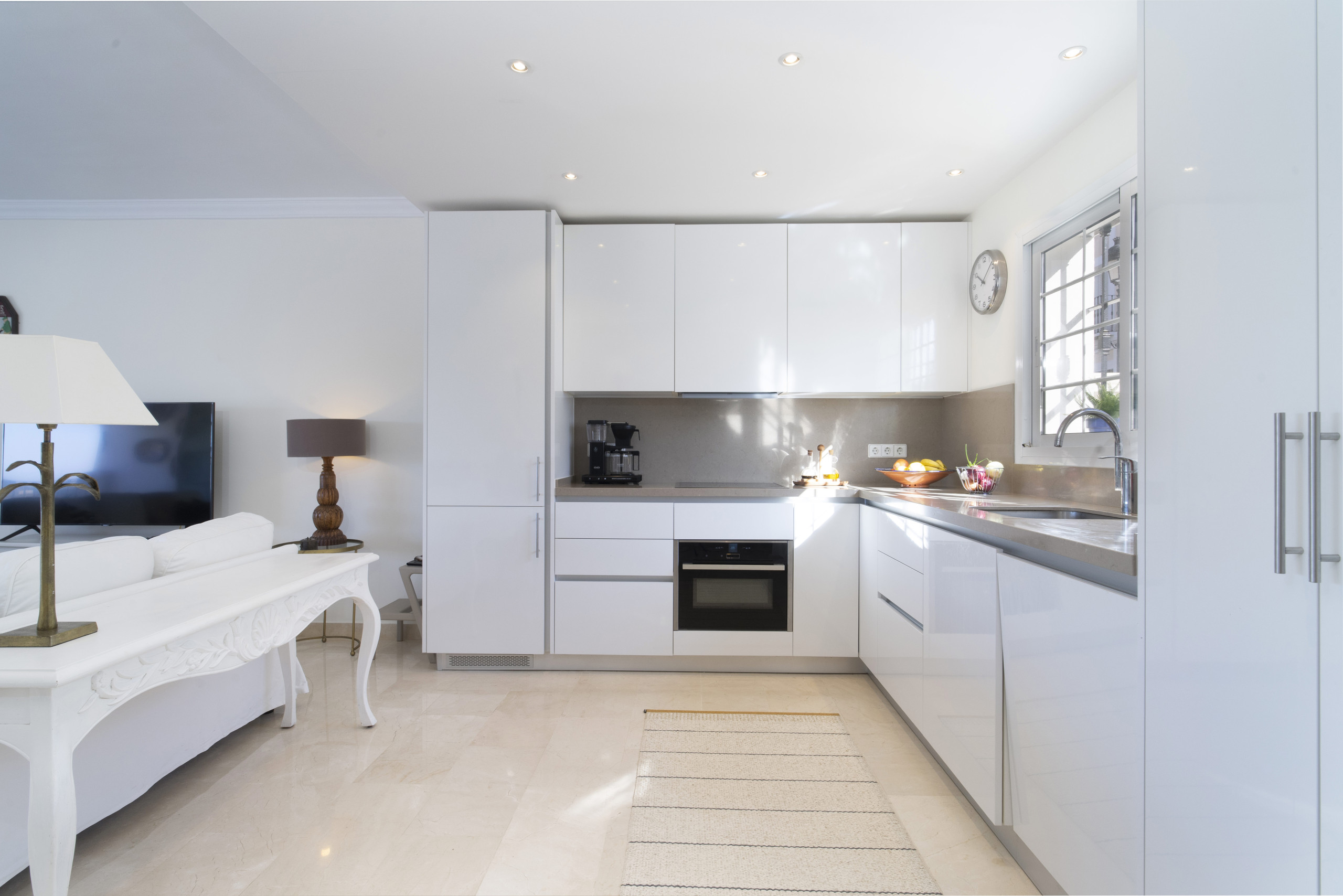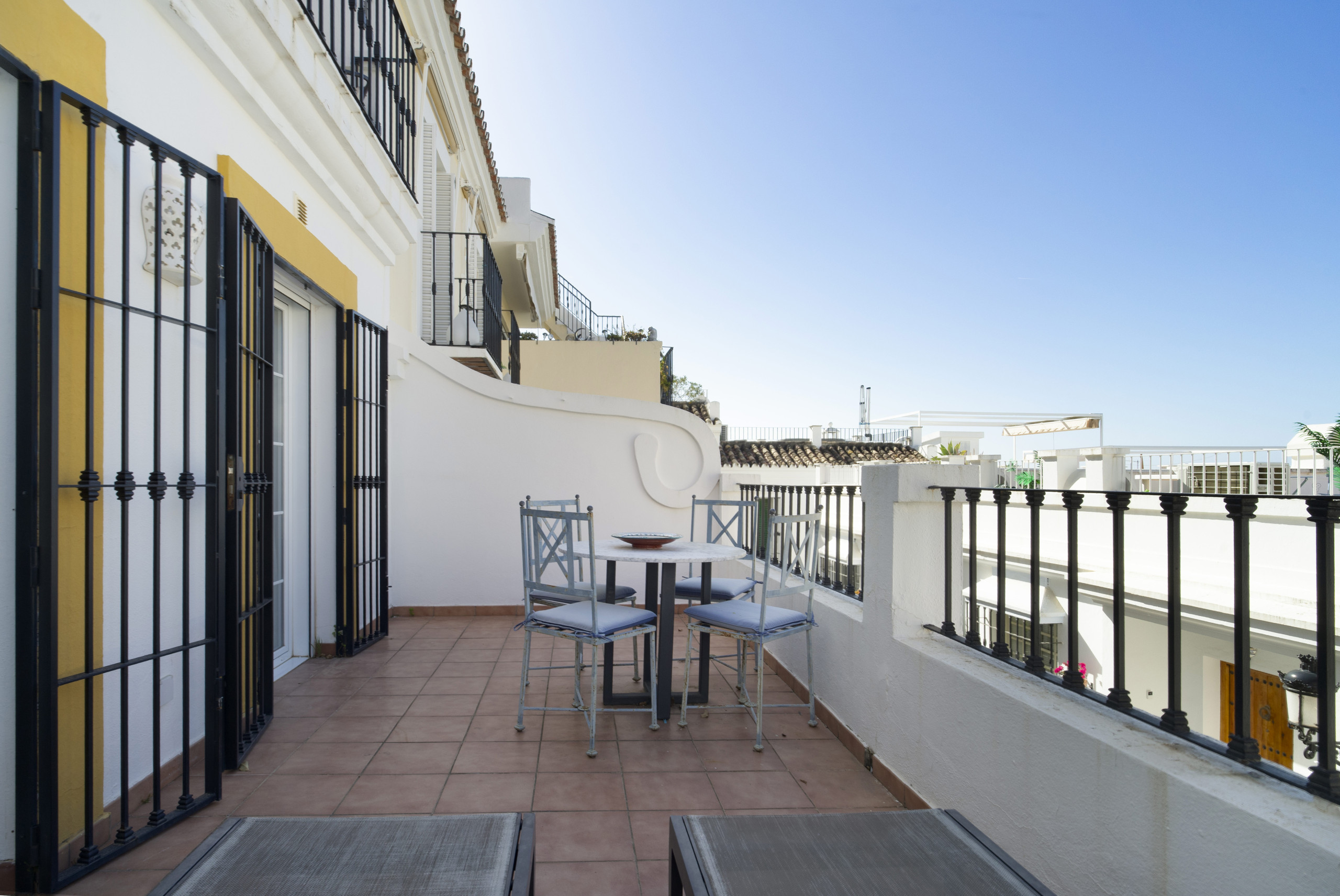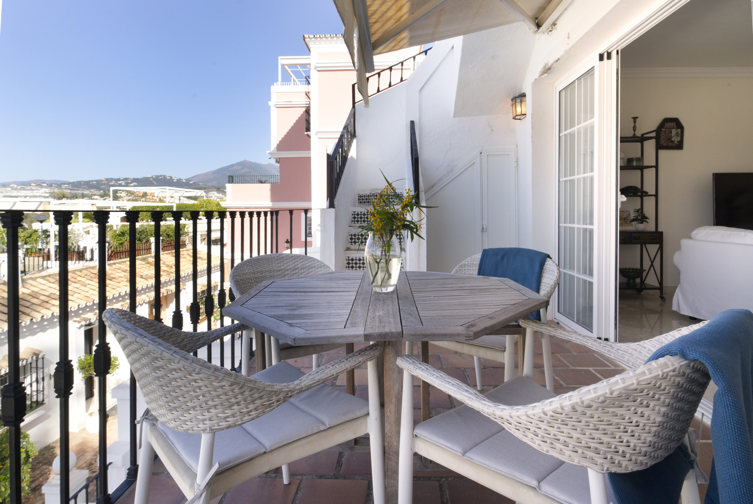 När du träder in i denna inbjudande hyreslägenheten välkomnas du av ett ljust och luftigt öppet planlösningsrum på första våningen. Stora fönster ramar in vackra vyer över Marbella, medan det öppna köket och vardagsrummet skapar den perfekta miljön för avslappnad inomhus-utomhus-vistelse. Glasdörrarna öppnas helt, vilket gör att du sömlöst kan förbinda interiören med den omgivande scenografin.