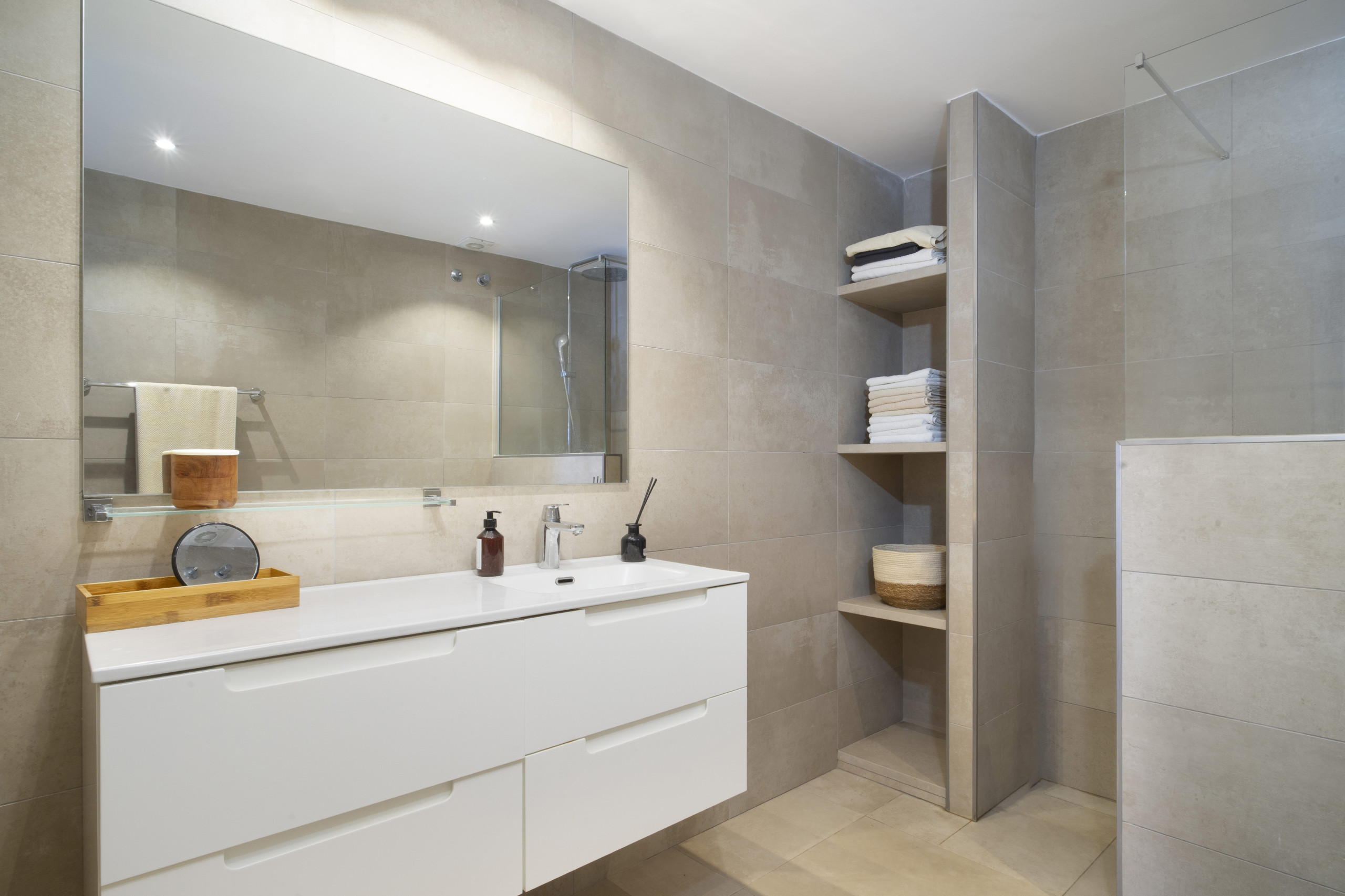 Nere i lägenheten finns två rymliga sovrum, var och en med ett helt renoverat eget badrum, som erbjuder både komfort och integritet.