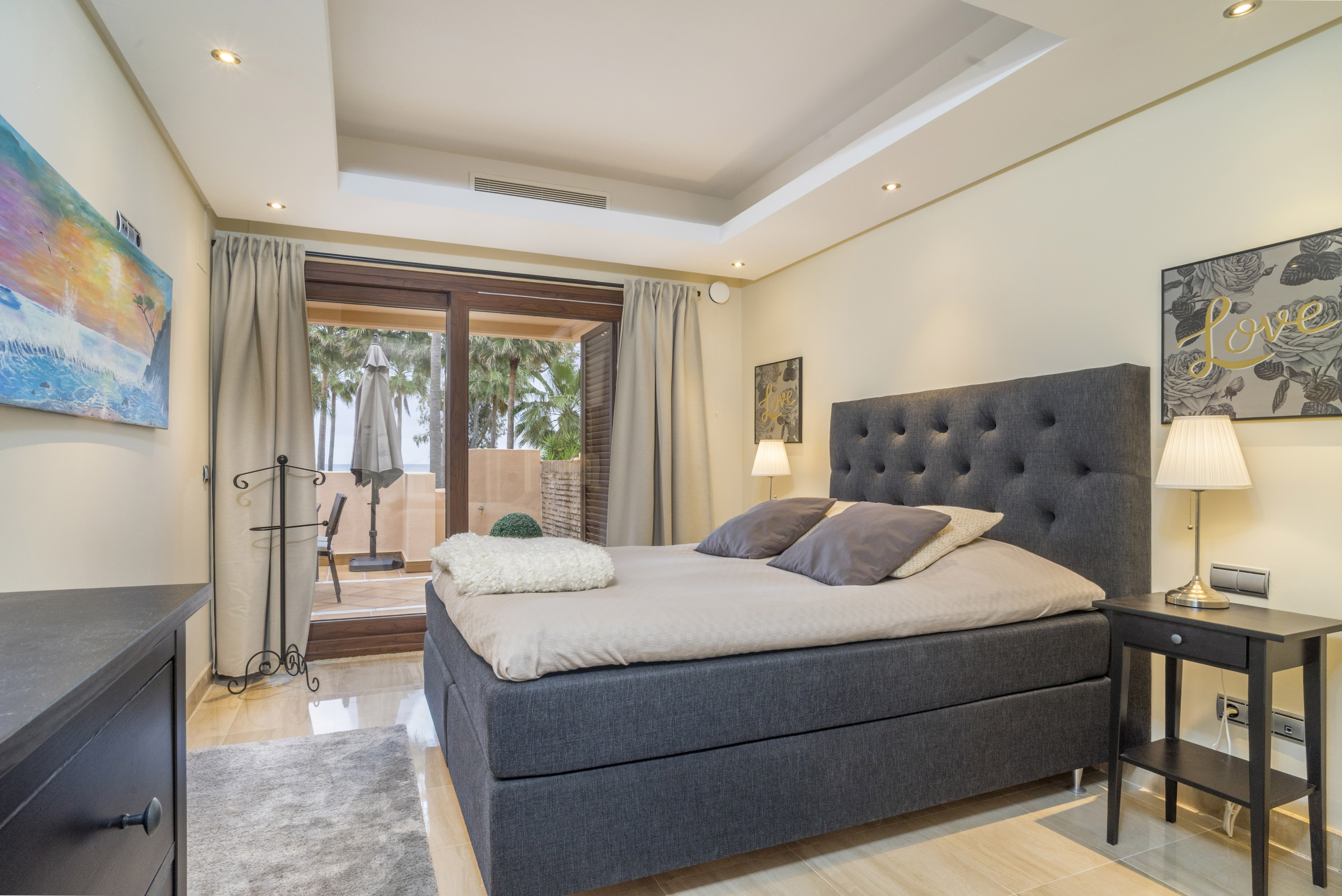 Huvudsovrummet inkluderar ett eget badrum och har direkt tillgång till terrassen, medan det andra sovrummet har utsikt över frodig grönska och erbjuder en mysig, vilsam atmosfär. Båda sovrummen har inbyggda garderober och är stilfullt designade i mjuka, neutrala toner för att skapa ett lugnt och välkomnande utrymme.