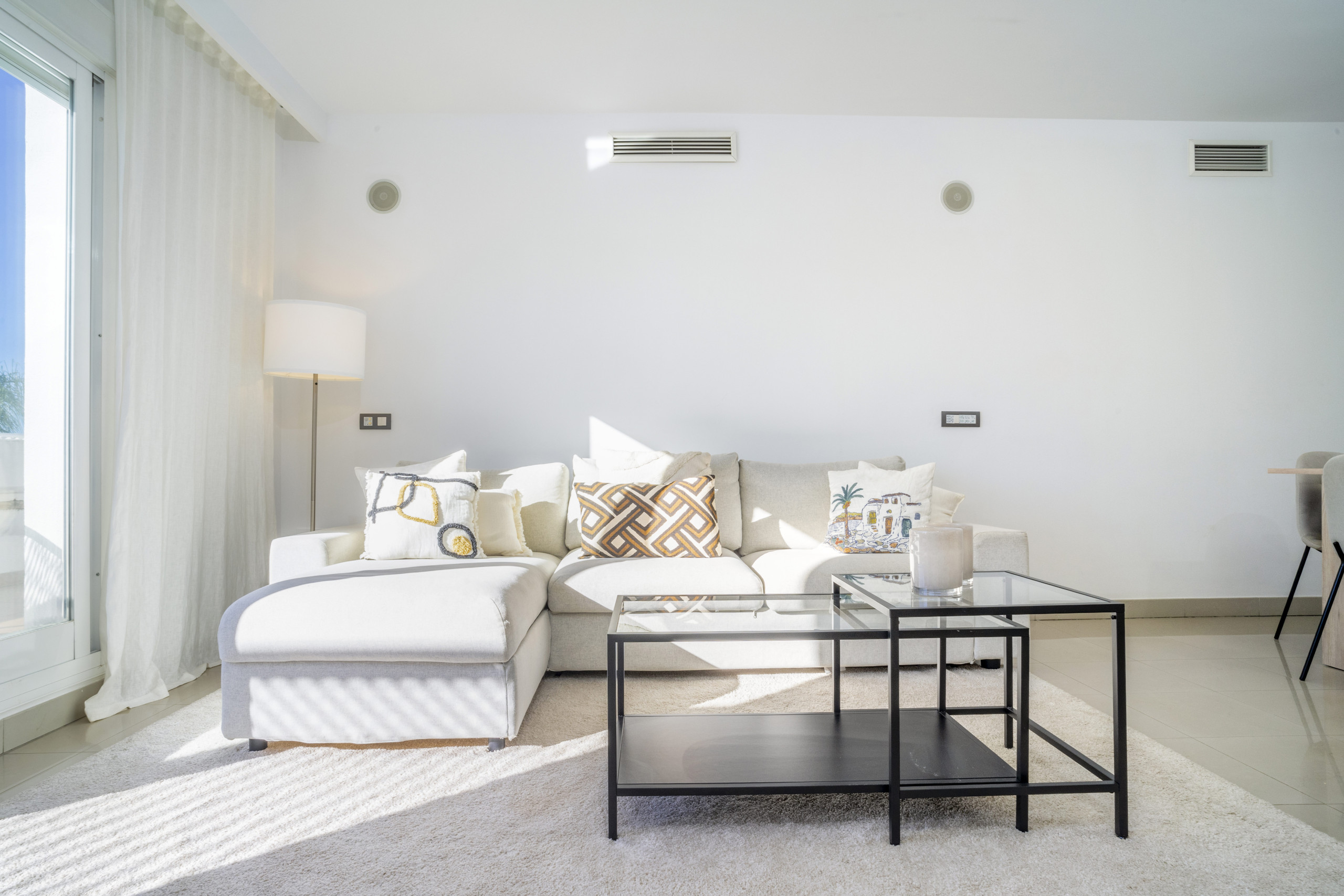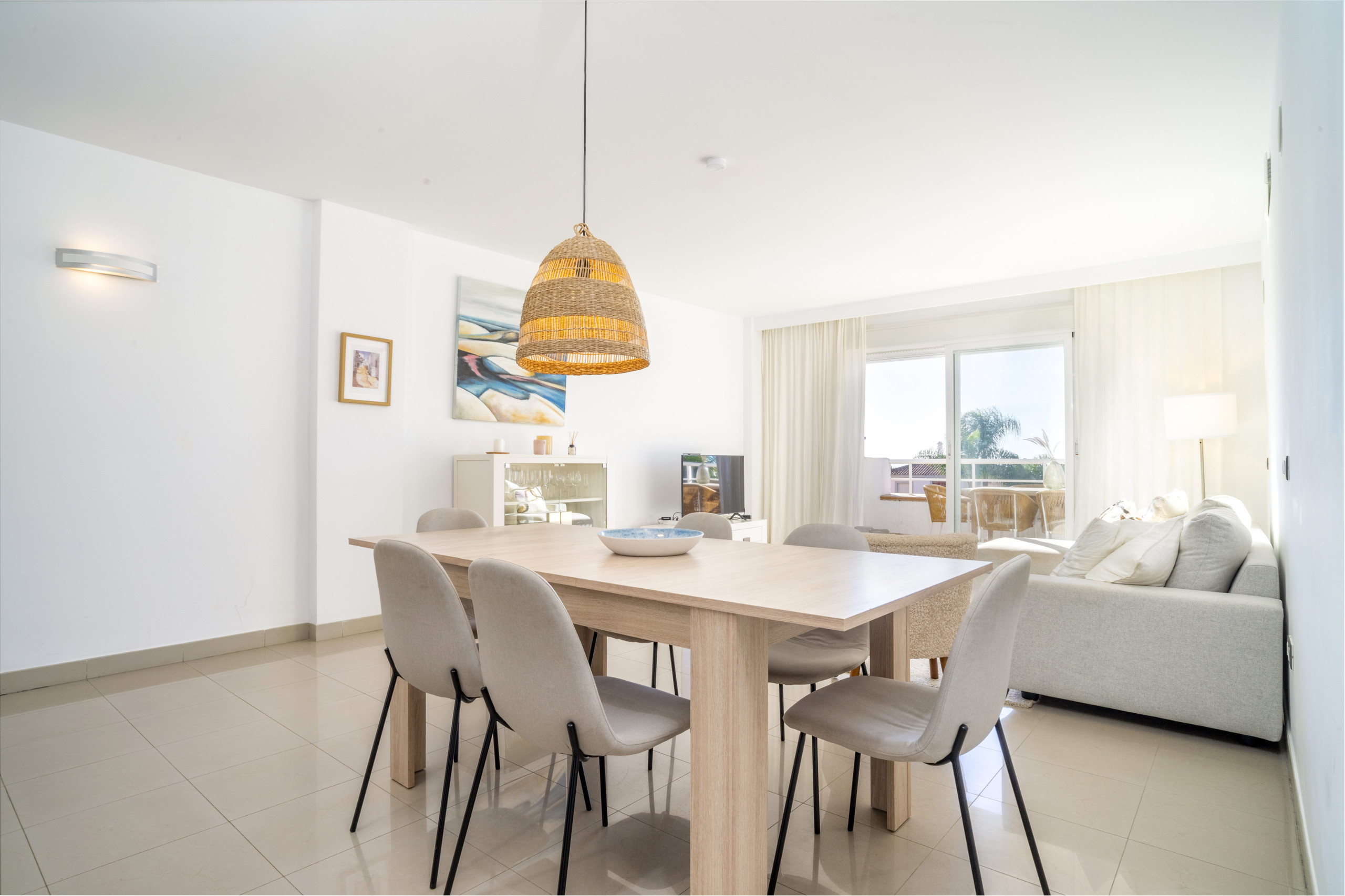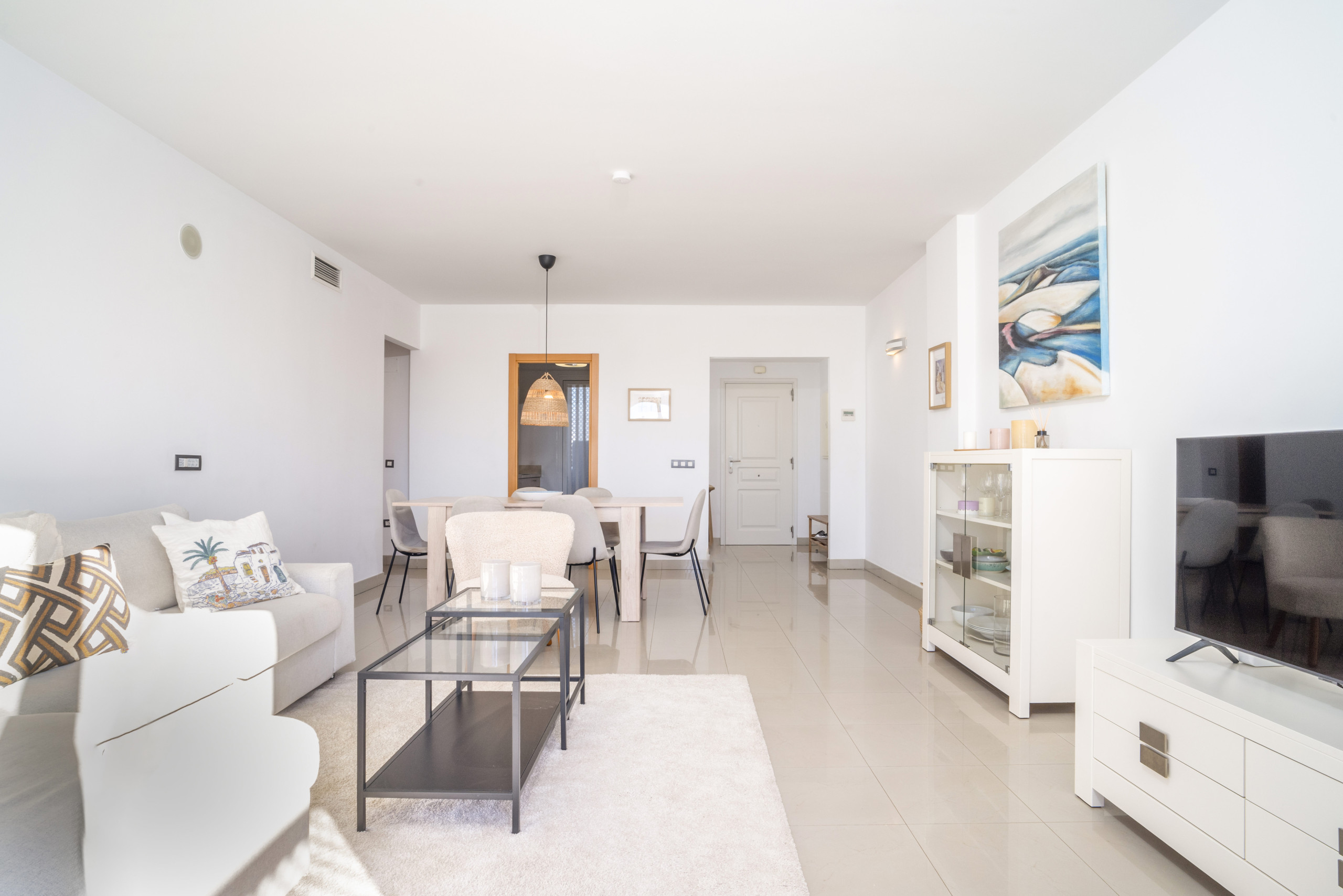 Välkommen till denna exceptionella hyreslägenhet med 2 sovrum och 2 badrum i det prestigefyllda Bahia de la Plata, beläget vid stranden med direkt tillgång till den pittoreska strandpromenaden. Detta vackert designade hem erbjuder ett rymligt vardagsrum, översvämmat med naturligt ljus, vilket skapar en ljus och välkomnande atmosfär.