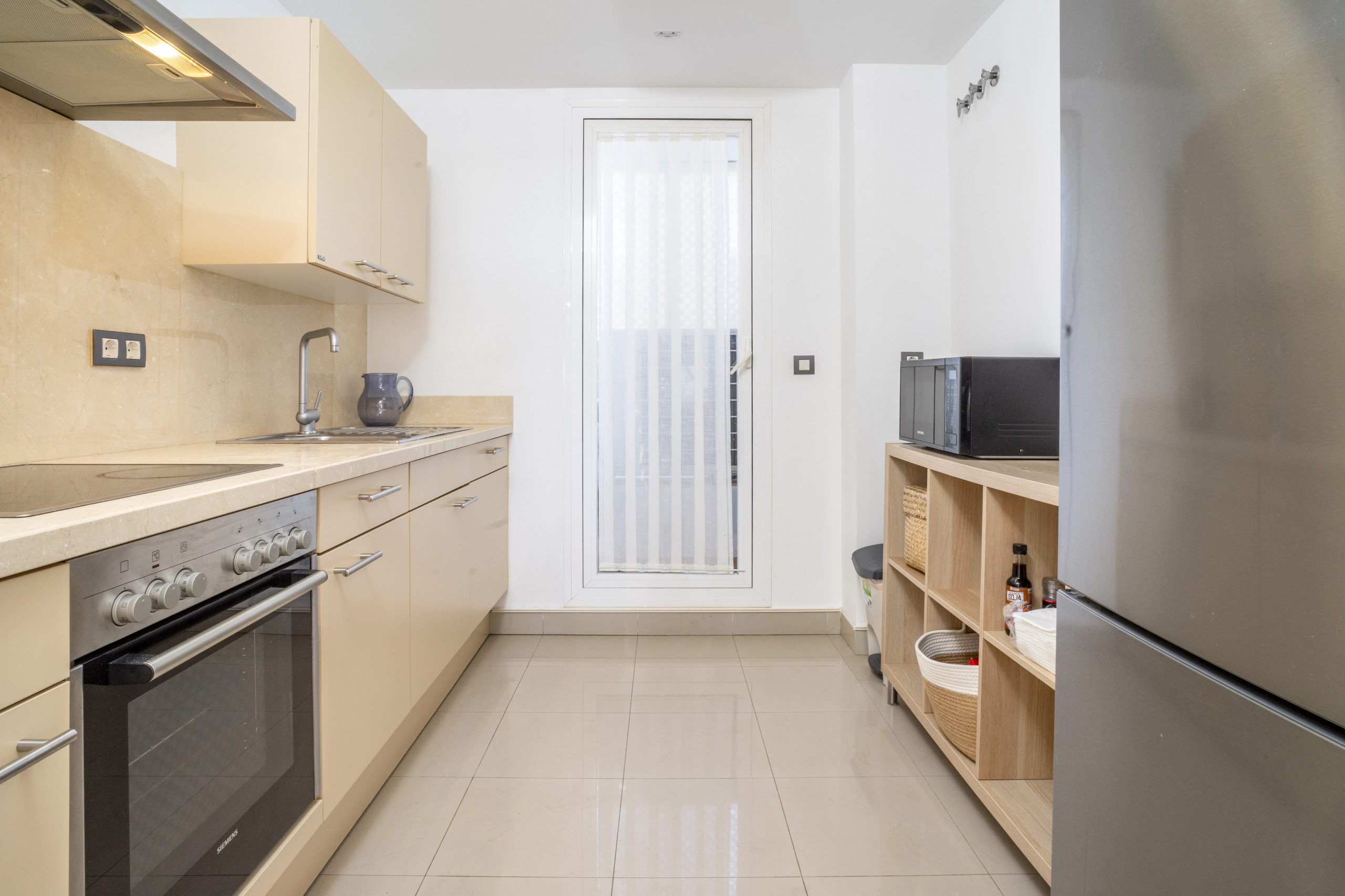 Lägenheten välkomnar dig med ett ljust, öppet planlösningsrum för vardagsrum och matplats som är elegant dekorerat och badat i naturligt ljus, skjutdörrar i glas som öppnas direkt ut mot en privat täckt terrass. Det fullt utrustade köket har granitbänkskivor och alla väsentliga hushållsapparater, tillsammans med en charmig frukosthörna för avslappnade måltider.
