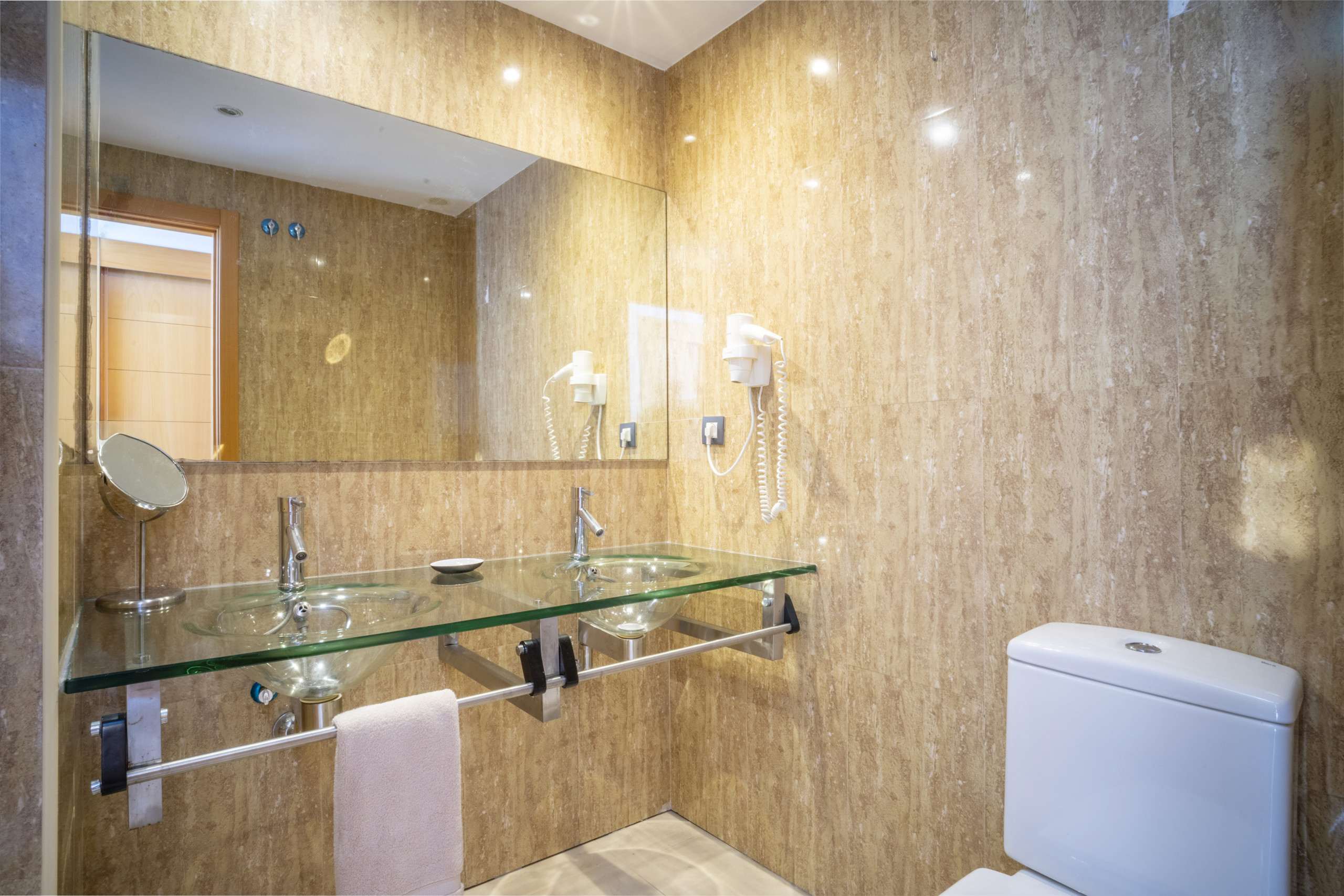 Huvudsovrummet inkluderar ett eget badrum och har direkt tillgång till terrassen, medan det andra sovrummet har utsikt över frodig grönska och erbjuder en mysig, vilsam atmosfär. Båda sovrummen har inbyggda garderober och är stilfullt designade i mjuka, neutrala toner för att skapa ett lugnt och välkomnande utrymme.