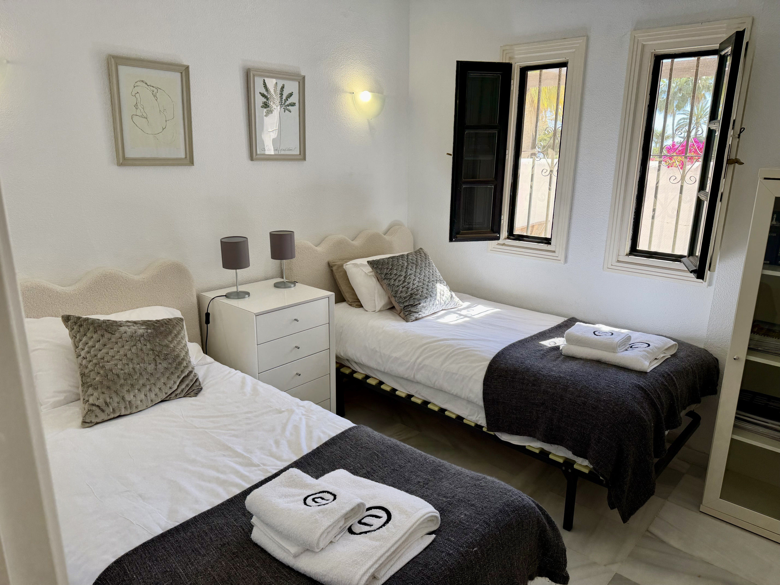 Detta är en lägenhet på bottenvåningen i söderläge När du kommer in i fastigheten kliver du in i det öppna köket som har renoverats och vardagsrummet med stor Smart TV, med massor av appar tillgängliga att välja mellan. Wifi ingår. Härifrån finns det direkt tillgång ut till den oslagbara terrassen som är en stor storlek. Här har du två solstolar, loungedel och matbord för 4 personer. Fastigheten kommer med två sovrum. Det stora sovrummet med eget badrum och direkt tillgång till terrassen och gästrummet med två enkelsängar och tillgång till separat badrum. Det finns en hårtork.