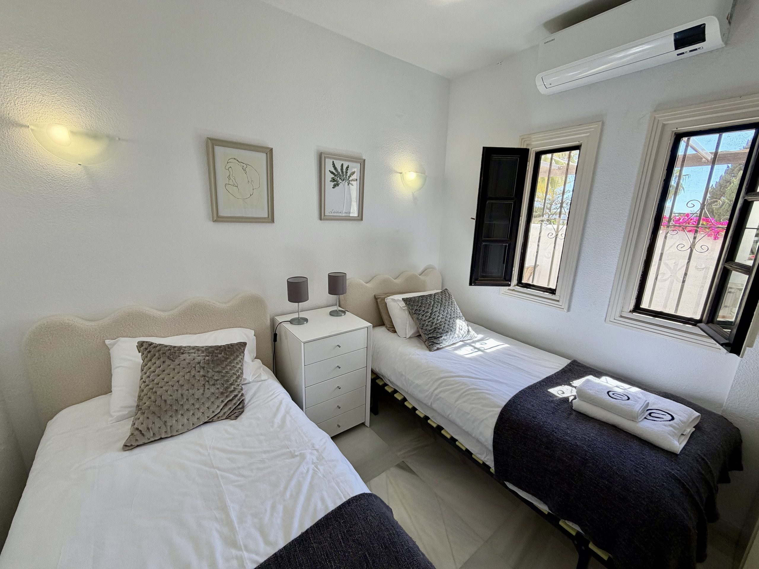 Lägenhet med 2 sovrum för semesteruthyrning i Aloha Gardens, ett gated community med 24-timmars bevakning. I området finns vackra gemensamma trädgårdar och 3 pooler, varav en är uppvärmd. Lägenheten är totalrenoverad och innehåller ett uppdaterat kök, två sovrum i bra storlek, 1 badrum med hydromassage och ett bekvämt vardagsrum med utgång till terrassen. Fantastisk lägenhet på ett utmärkt läge. Fastigheten har spanska TV-kanaler och även Apple TV-system där även Netflix kan användas.