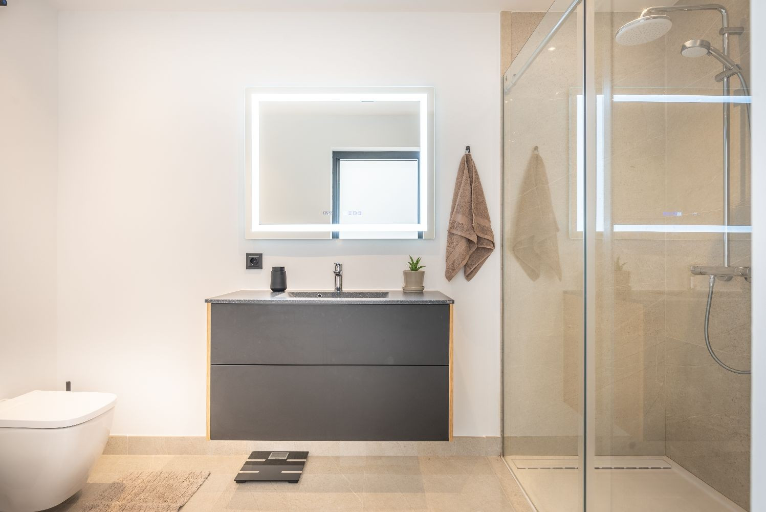 När du kommer in, sätter en charmig privat uteplats tonen. Inuti finns det ett öppet modernt kök som smälter sömlöst samman med vardagsrum och matplats. Det finns också ett bekvämt extra sovrum med två enkelsängar på denna våning, idealiskt för barn eller gäster (ingen AC i detta rum, endast i vardagsrummet, men tysta fläktar finns ), och ett tredje badrum med walk-in-dusch.