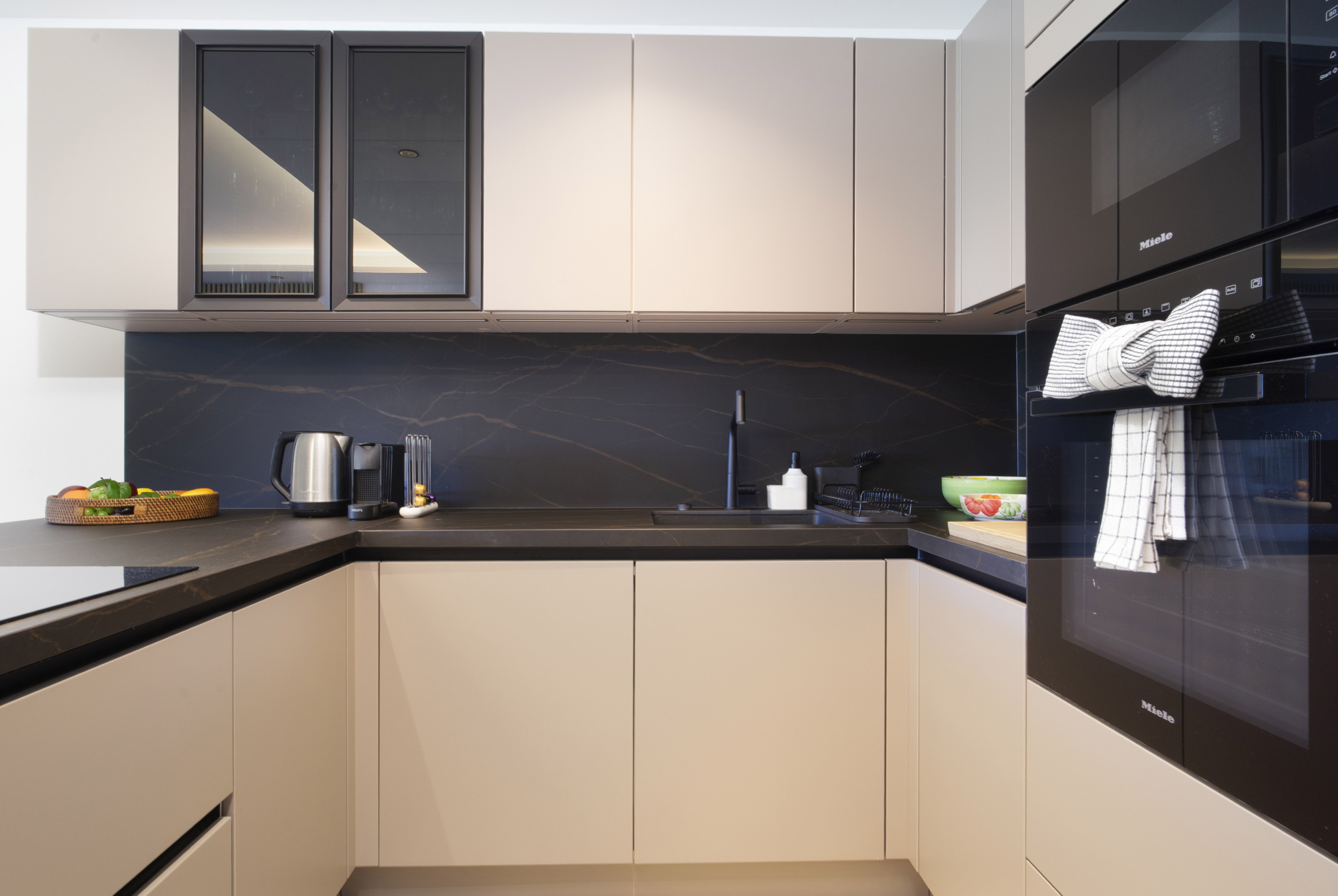 Den/det Öppet kök, är utrustat med kyl, mikrovågsugn, ugn, frys, tallrikar/bestick, köksredskap och kaffemaskin