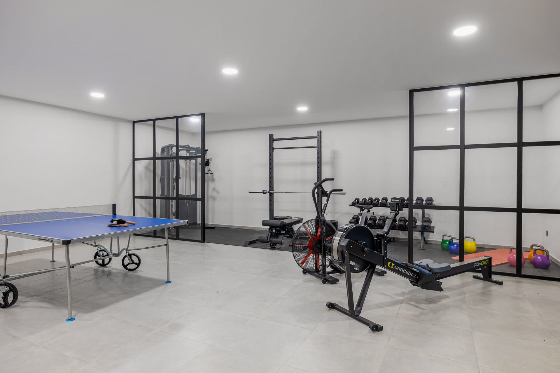Den nedre nivån i den här villan är idealisk för underhållning. Den har ett underhållningsrum med soffa, stor tv och biljardbord. Det finns också en vinkällare, ett spa-område med finsk bastu och dusch med ångbehandling. På denna nivå finns också en del gymutrustning och ett pingisbord som är roligt för alla åldrar. Det femte sovrummet med naturligt ljus ligger också på denna nivå med eget badrum.